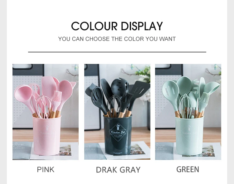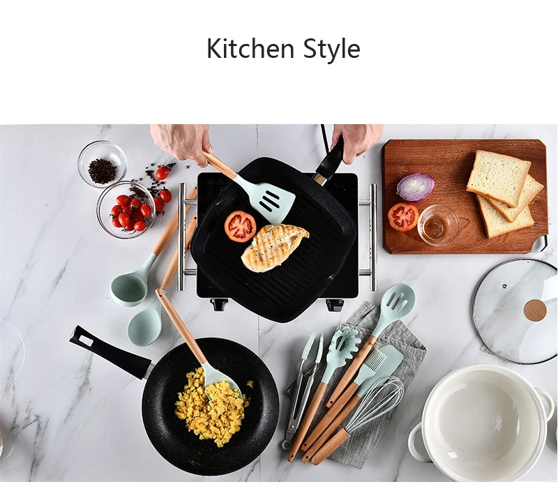 Silicone Utensil Set is a Kitchen helper, perfect for all types of foods and cooking&kitchen accessaries, stir fry, stirring cream, butter, ice cream, etc. Include spatula, basting brush, pointed spatula,round-edge turner, ladle, straight-edge turner, Spoon, tongs, pasta fork, and perfect for all types of foods and cooking.