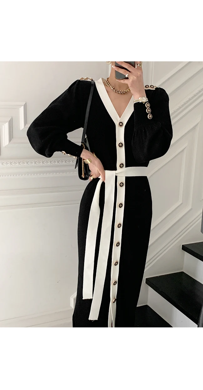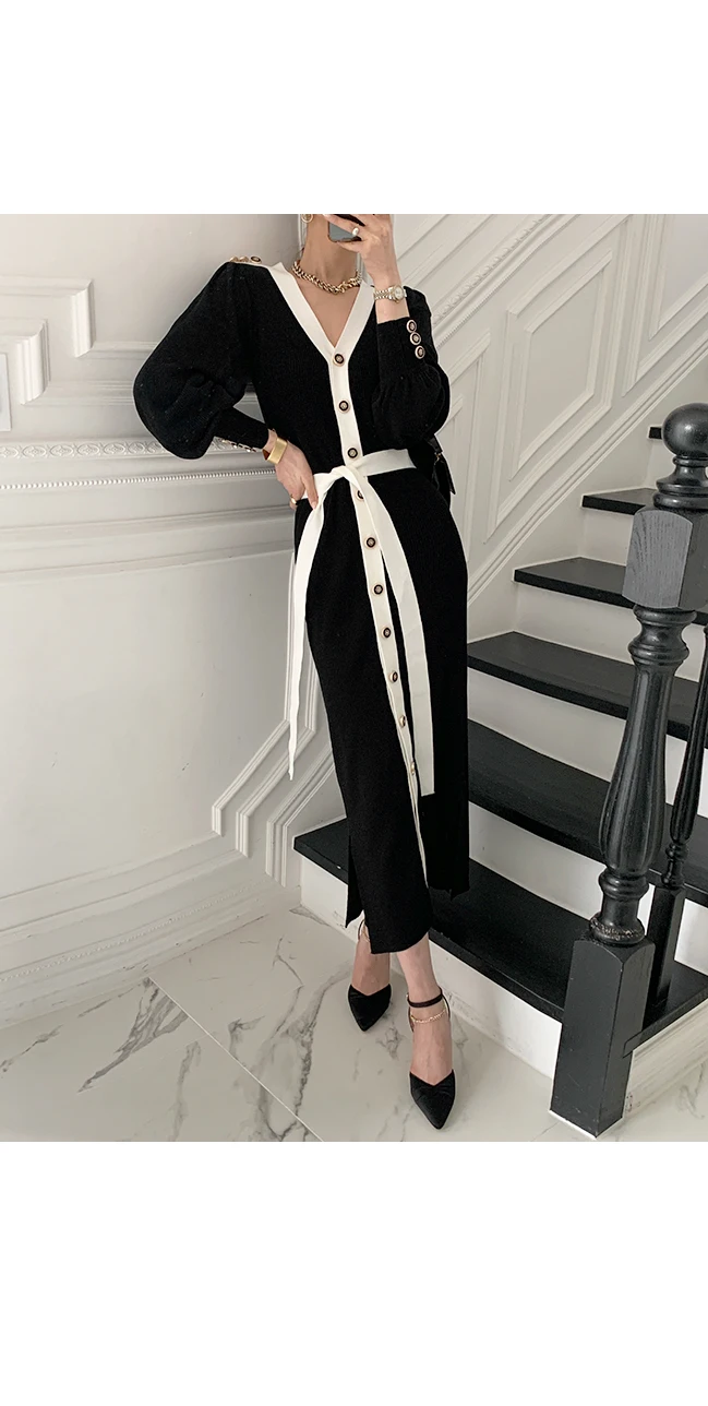 Belt Patchwork Knitted Sweater Dress is the symbol of elegance and femininity. In its version of shades, it sublimates the pure lines and simple silhouette. With buttons all the way up and on the shoulders, the dress gets more glamorous. The sleeves are slightly puffed and the V neck shape creates the perfect autumn winter dress.