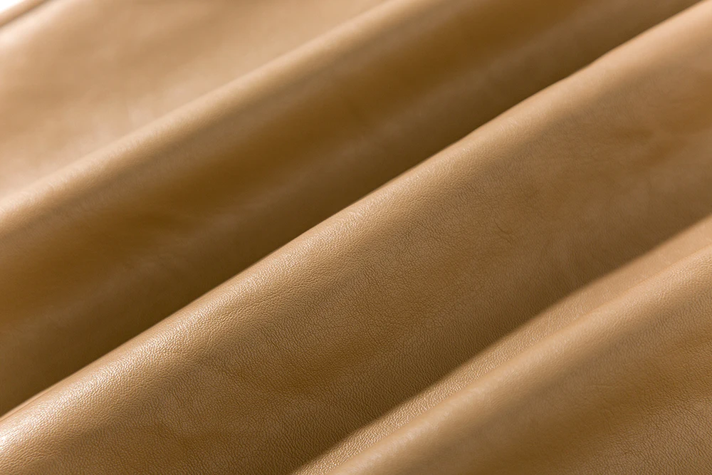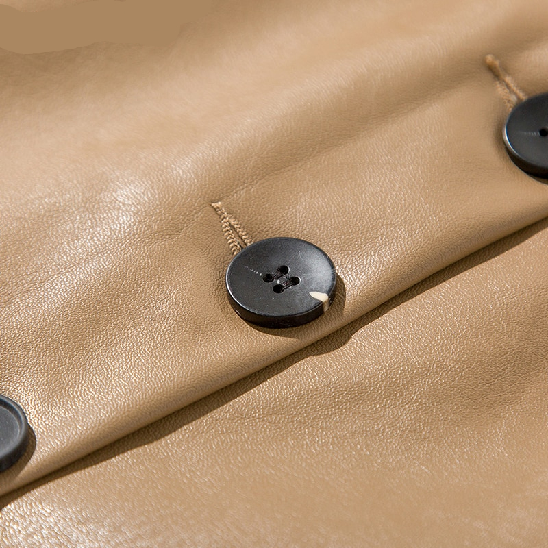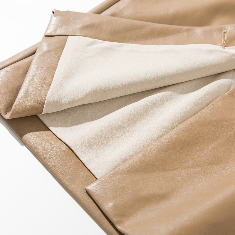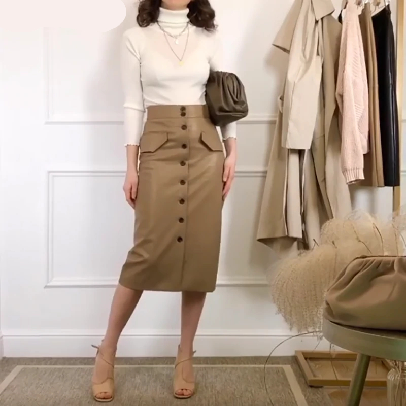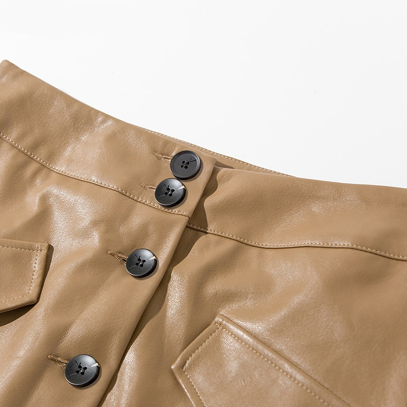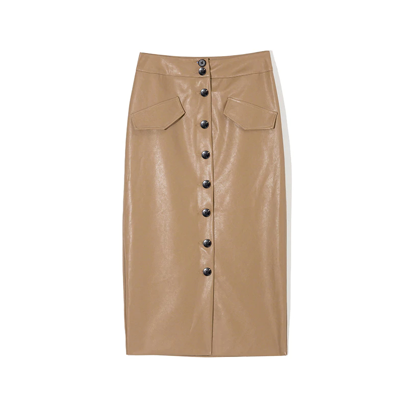 Coffee Elegant High Waist Faux Leather Pencil Skirt with multi buttons.