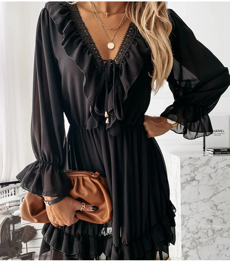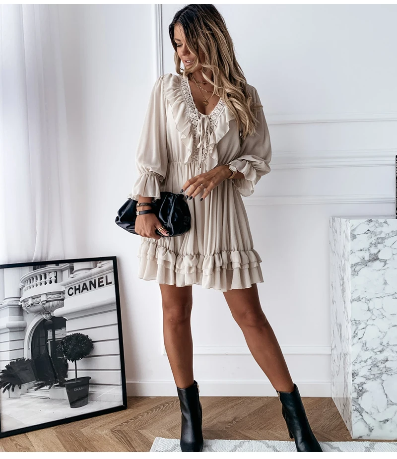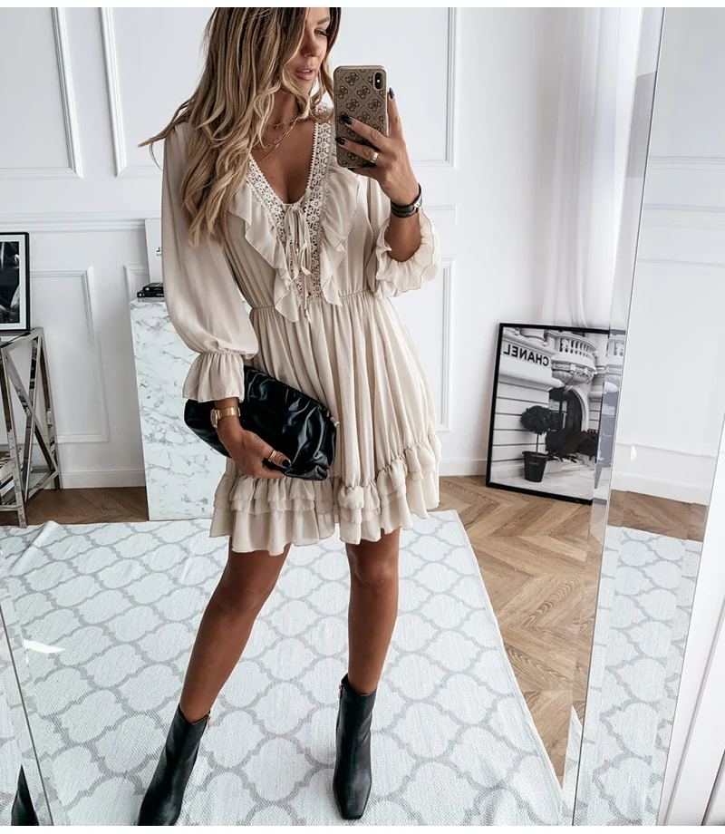 Creamy V Neck Chiffon Ruffle Mini Dress is the perfect dress for parties or going out, both chic and sexy. You can accessorize it with the right bag and shoes and your look will be entirely amazing!