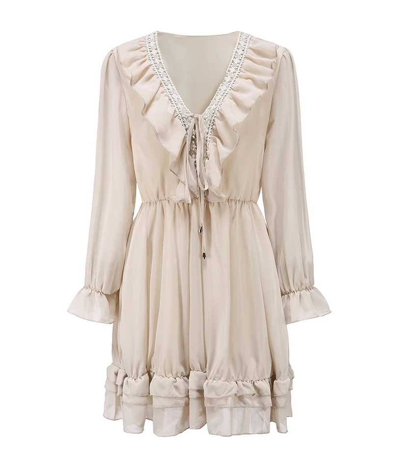 Creamy V Neck Chiffon Ruffle Mini Dress