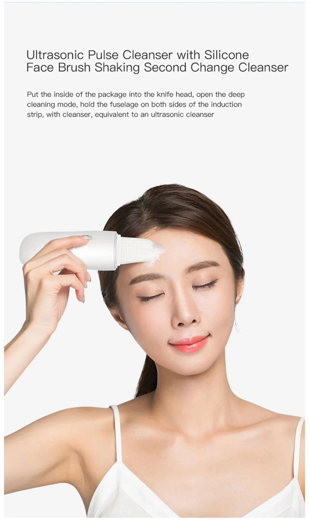 6. With the silicone facial brush, turn the body into a cleansing device in seconds, put the clean silicone sleeve in the package into the cutter head, turn on the deep cleaning mode, hold the sensor strips on both sides of the body, and use the cleanser, which is equivalent to an ultrasonic cleaning device