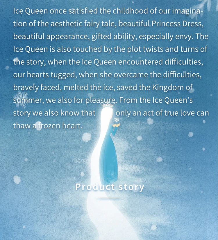 Ice Queen once satisfied the childhood of our imagination of the aesthetic fairy tale, beautiful Princess Dress, beautiful appearance, gifted ability, especially envy. The Ice Queen is also touched by the plot twists and turns of the story, when the Ice Queen encountered difficulties, our hearts tugged, when she overcame the difficulties, bravely faced, melted the ice, saved the Kingdom of summer, we also for pleasure. From the Ice Queen’s story, we also know that only an act of true love can thaw a frozen heart.