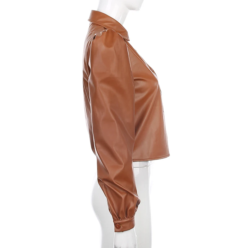 Faux Leather Brown Turn-Down Collar Blouse with buttons is the perfect chic look for autumn-winter. It has long puffy sleeves, a shirt-like collar, an elegant vibe with a slight vintage touch.