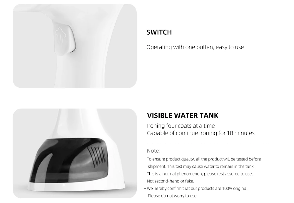 4.Visible Water tank —Ironing four coats at a time Capable of continuing ironing for 18 minutes