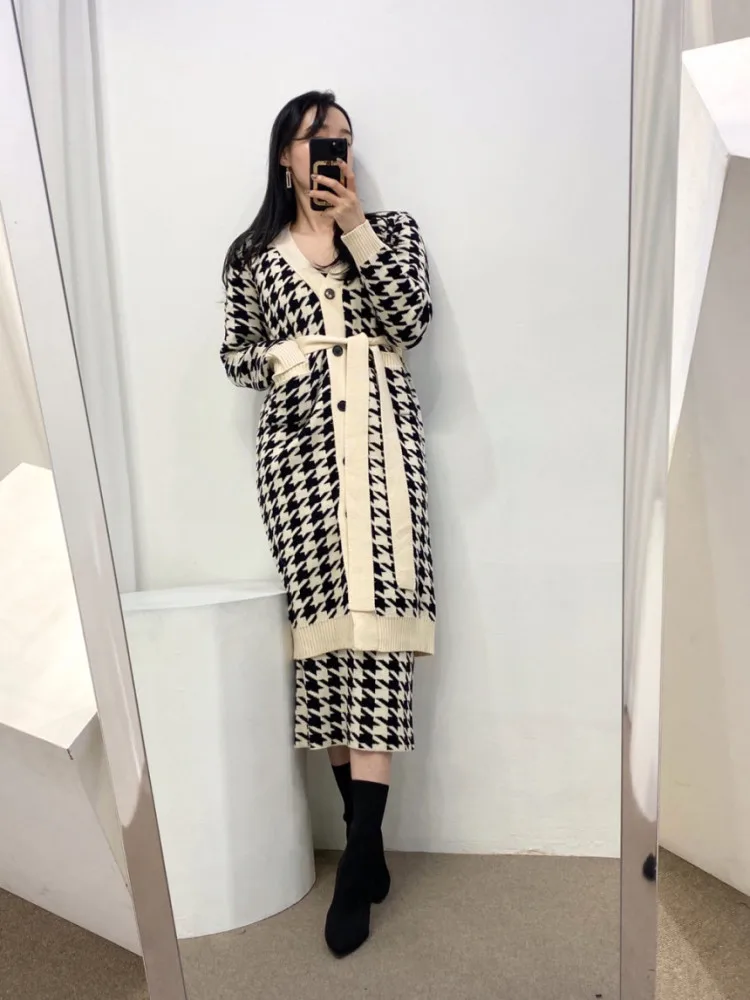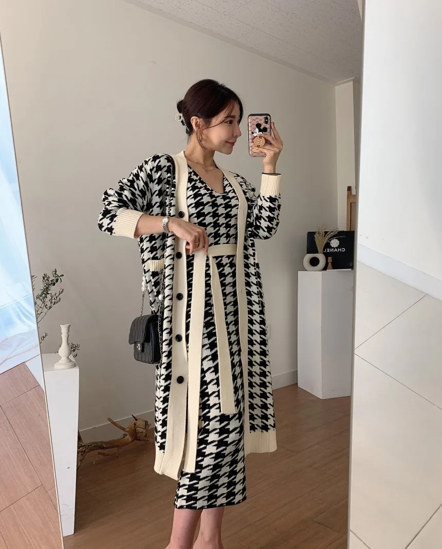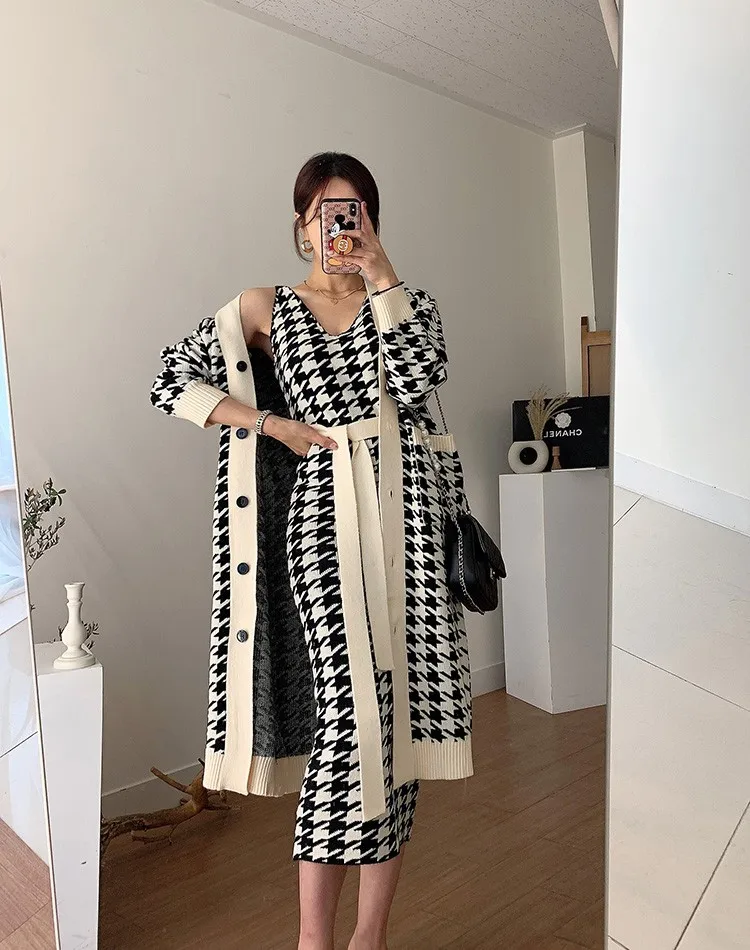 Houndstooth Knitted Cardigan And Sleelevess Dress
