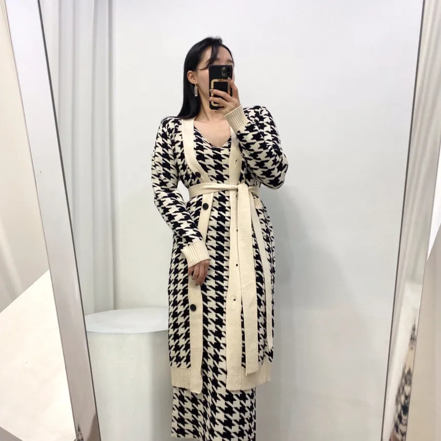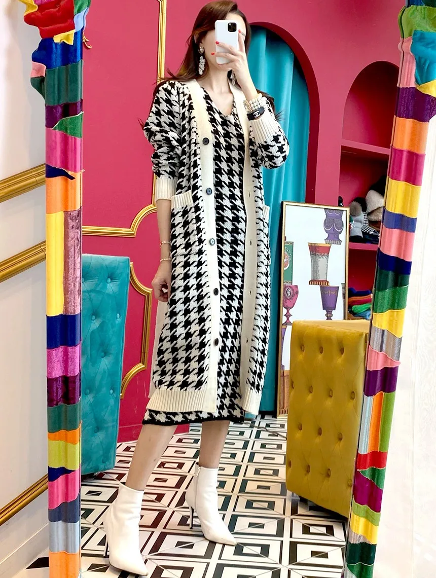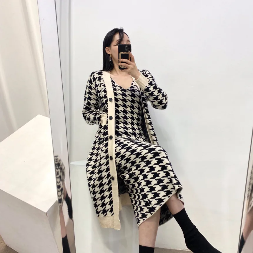 Houndstooth Knitted Two Piece Set Single-breasted Cardigan + Sleelevess Dress Korean Vintage Female Matching Set