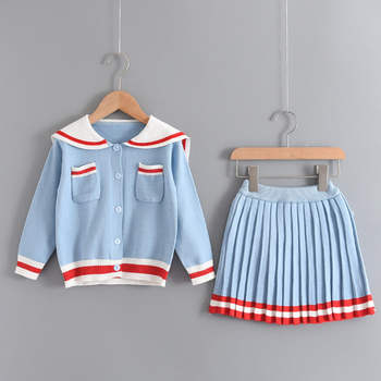 Girl Knitted Sailor Collar Long Sleeve Pullover+Skirt