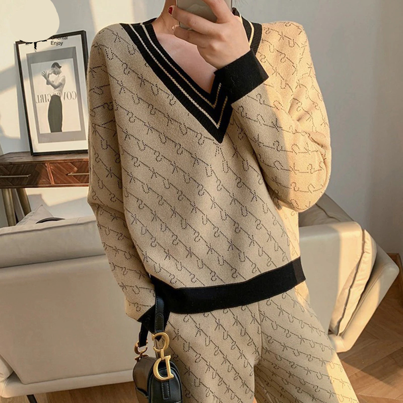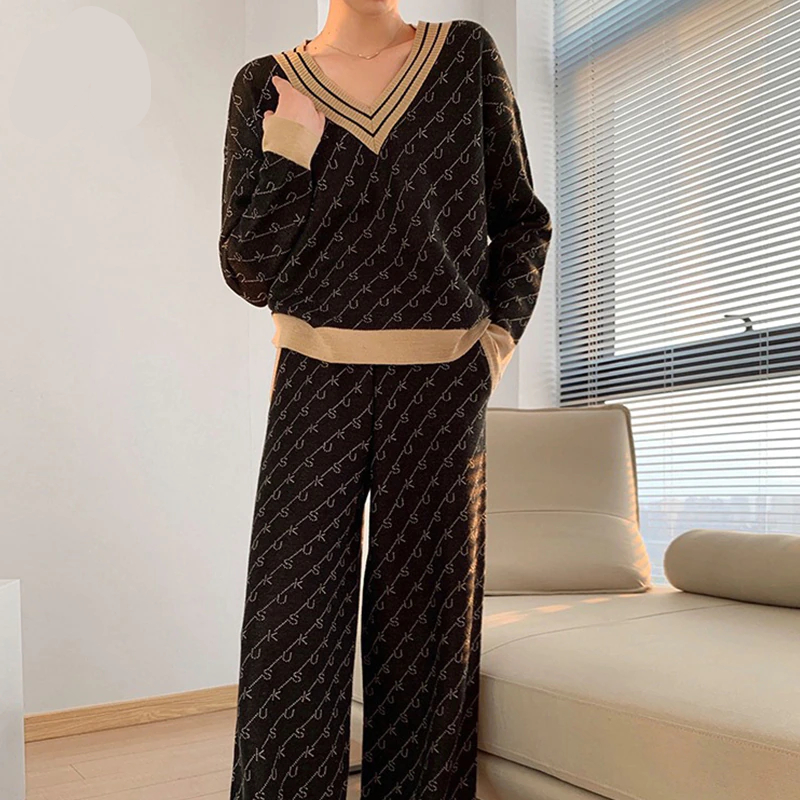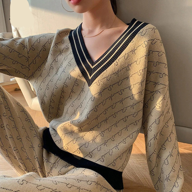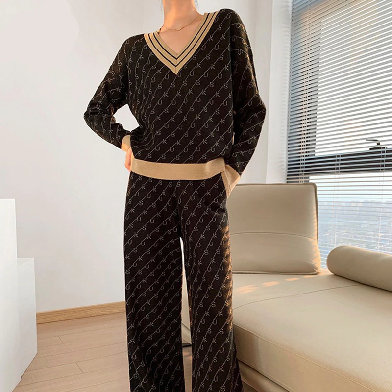 Knitted Wide Leg Pants And Sweater Set has a geometrical pattern design and a V-neck shape for a more feminine allure.