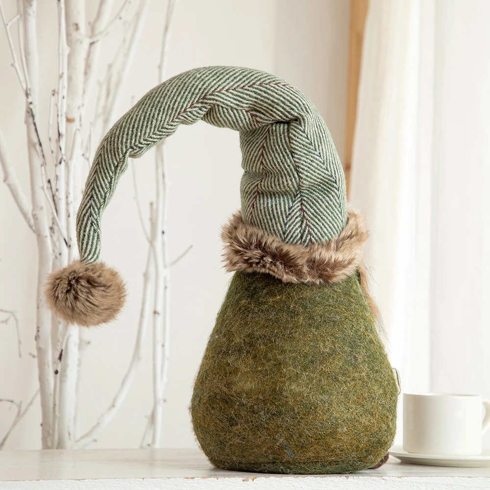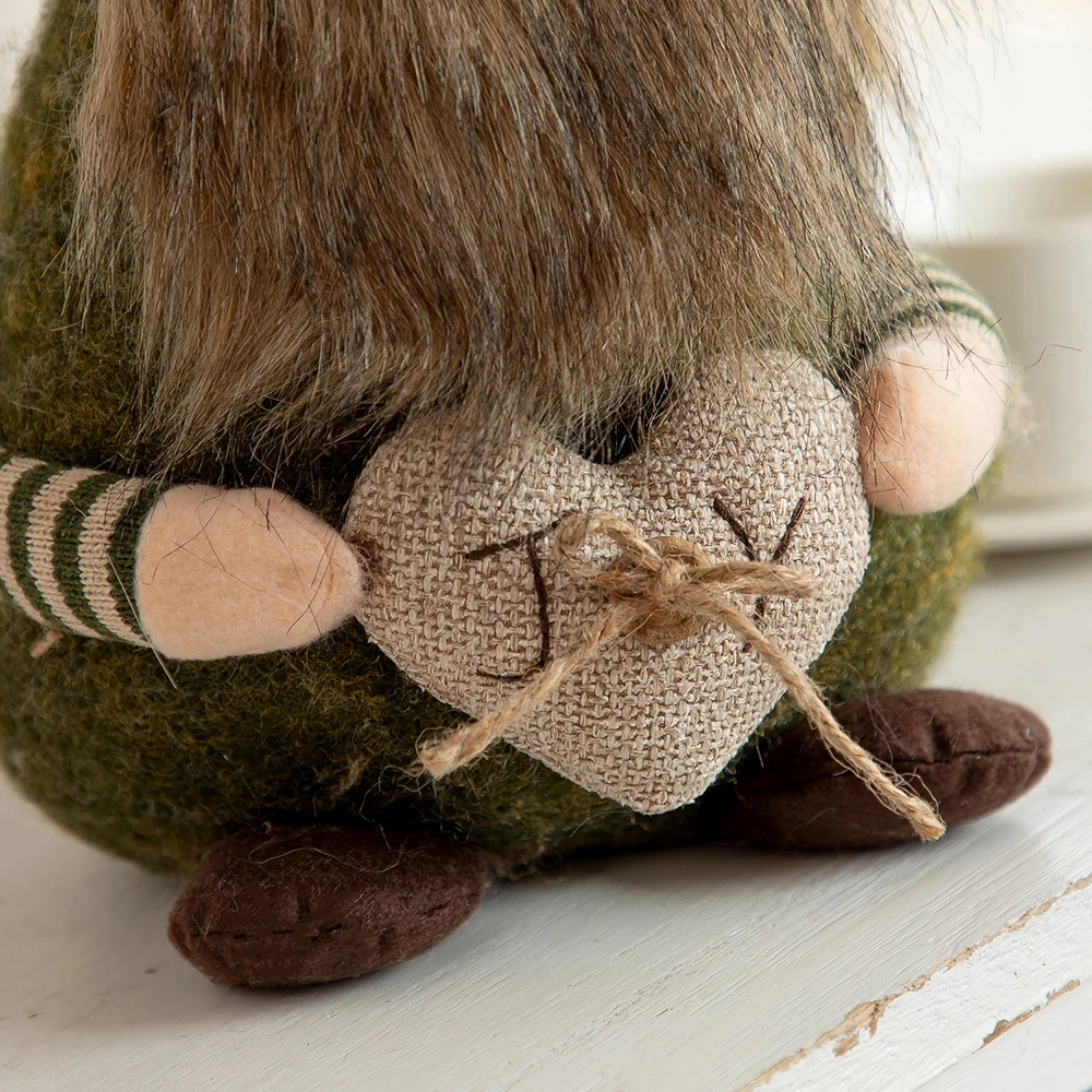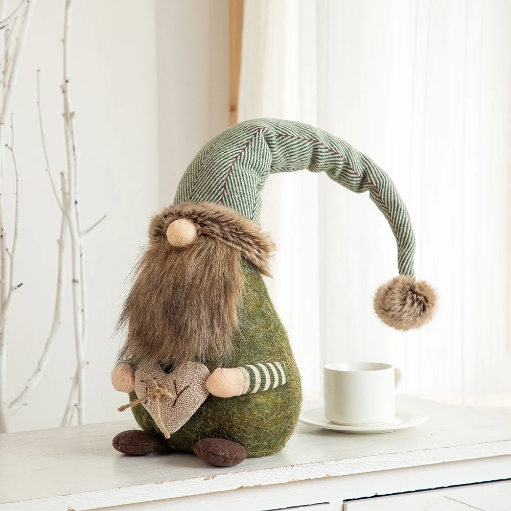1. This Nordic rustic midget is a living collectible, with a white and green striped tall hat on top of his plump dark green body and a big pompon top to highlight his cuteness (the hat can bend as it please). The dwarf holds a heart with the word “Joy” written on it to bring warmth and happiness to you.