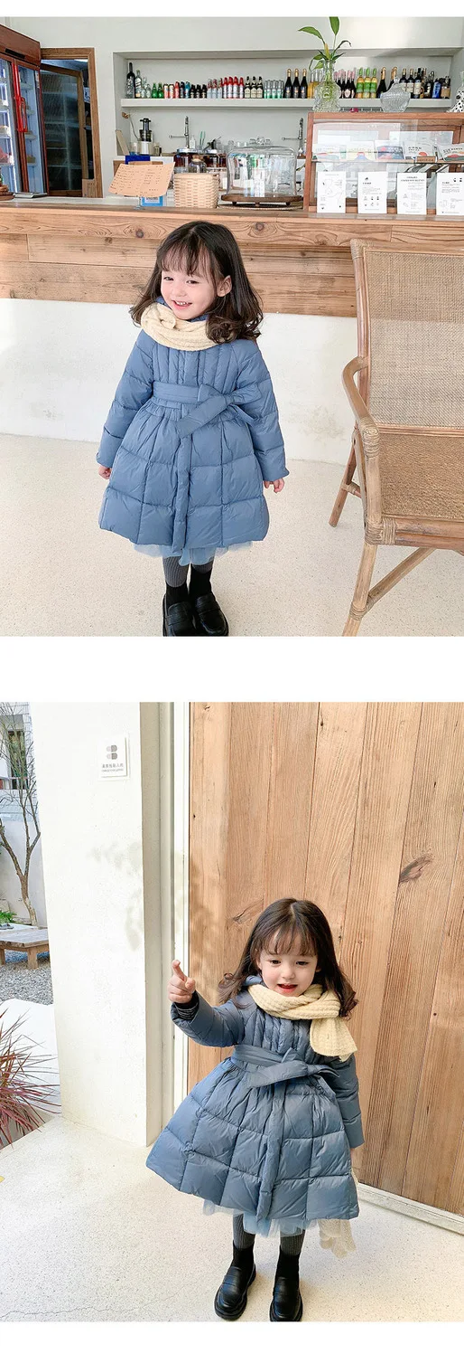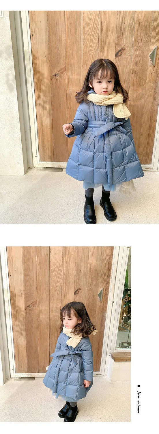 Long Parkas with Mesh Band For Girls is a very fashionable way to dress your little girl. In many colors, this coat is designed like a winter coat-dress with a belt and mesh at the bottom.