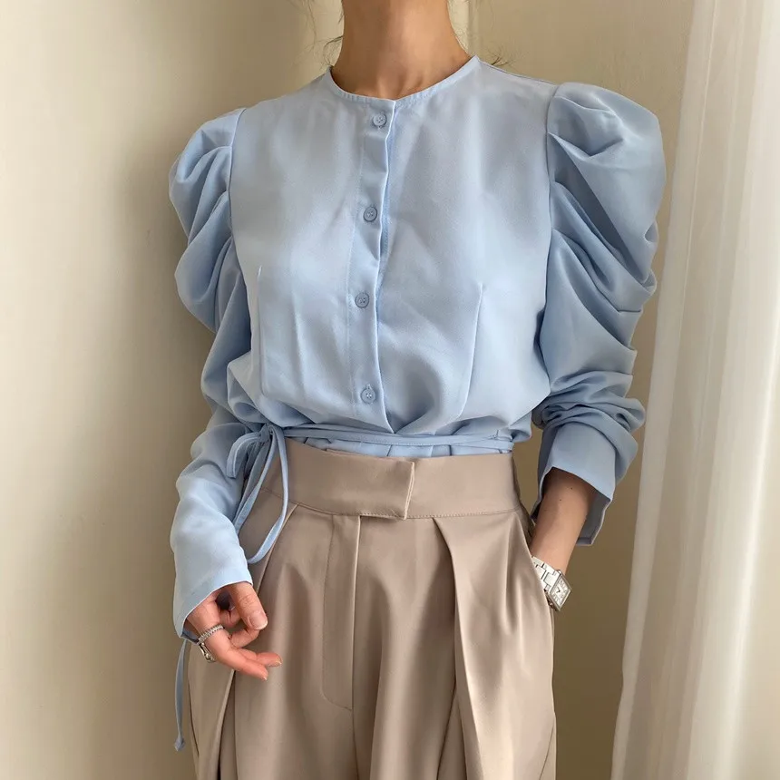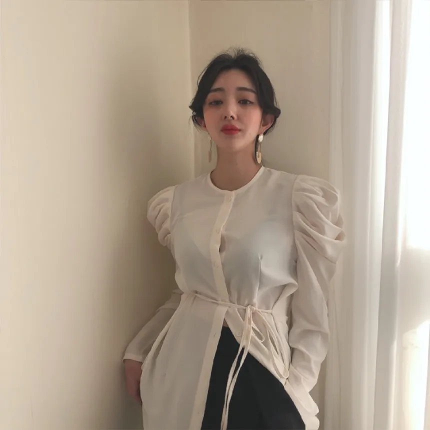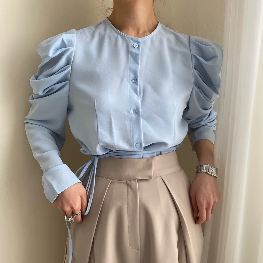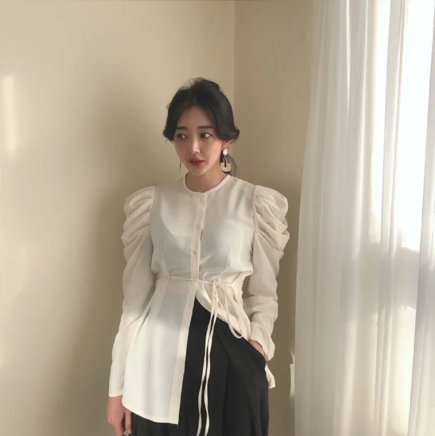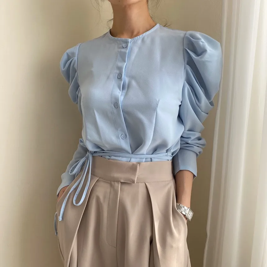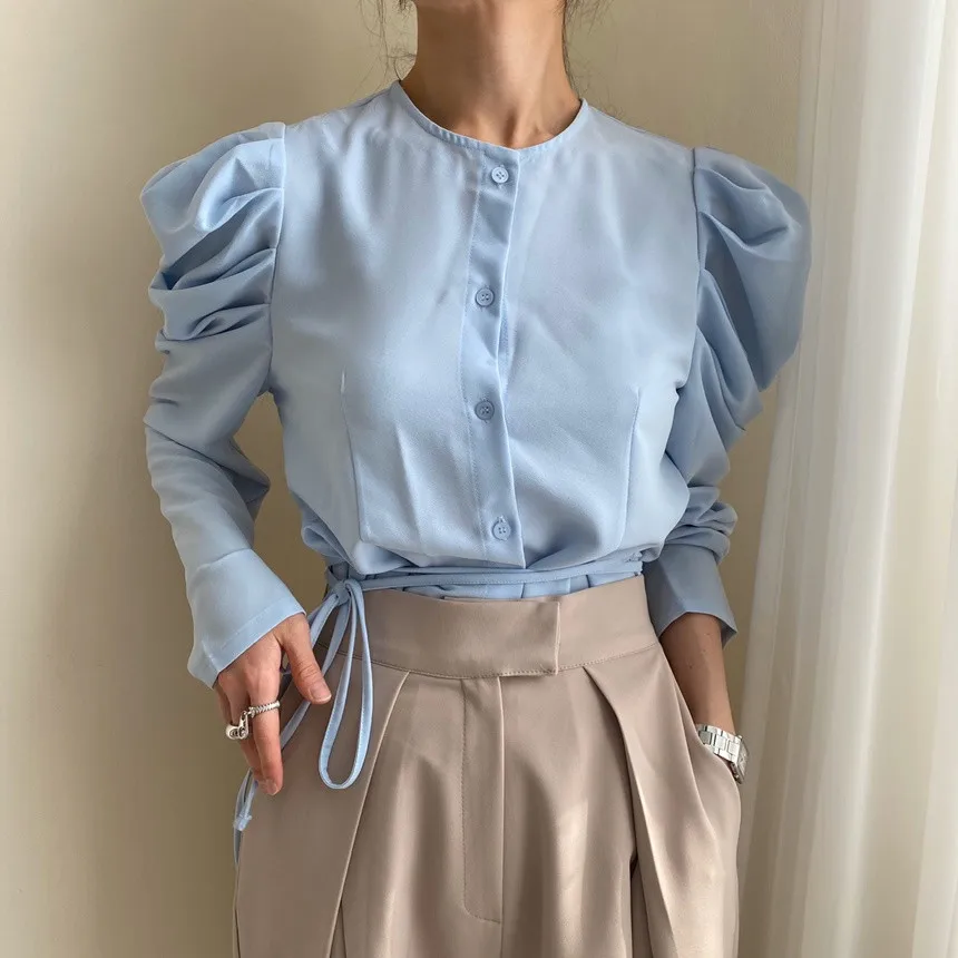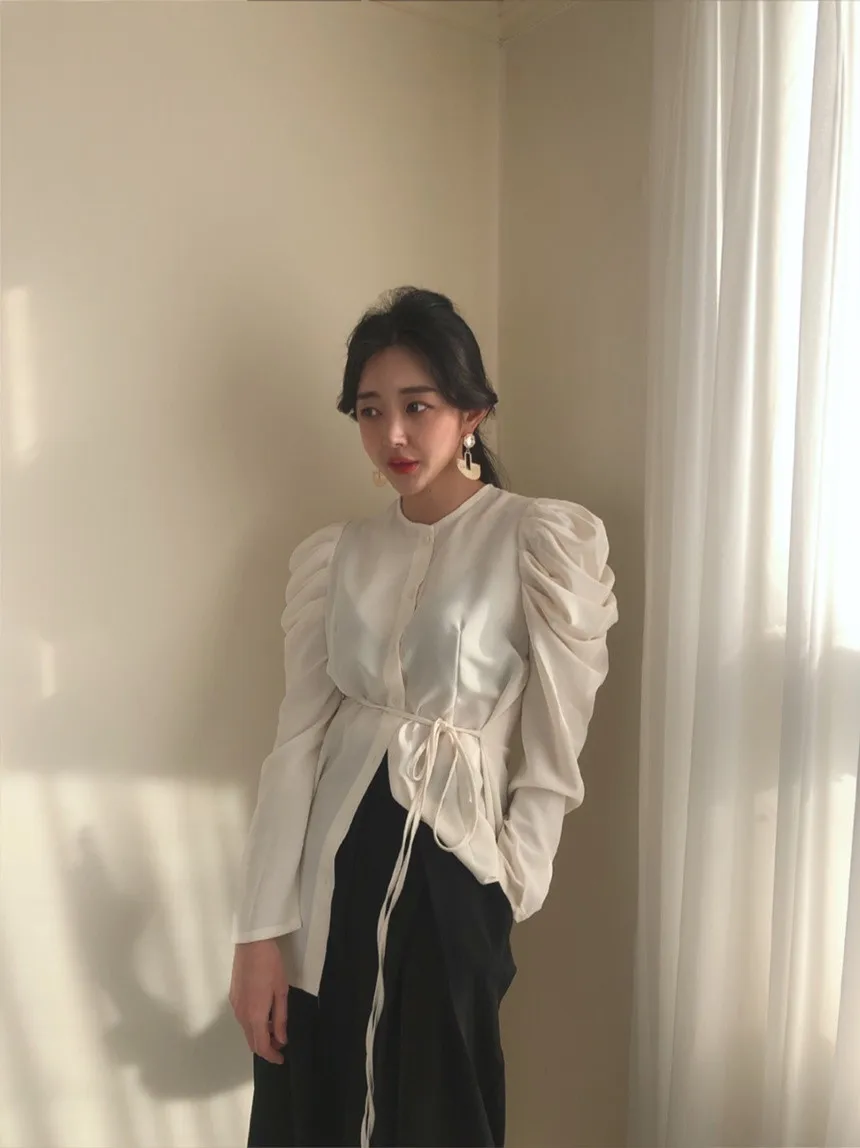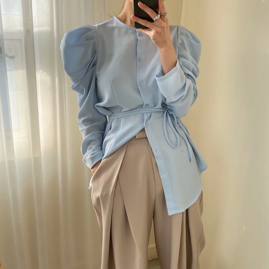 This shirt blouse can be mixed with jeans or elegant pants according to your mood and style. It has an o-neck shape, loose puffed sleeves, slim string.