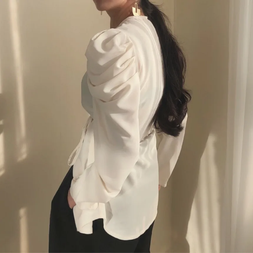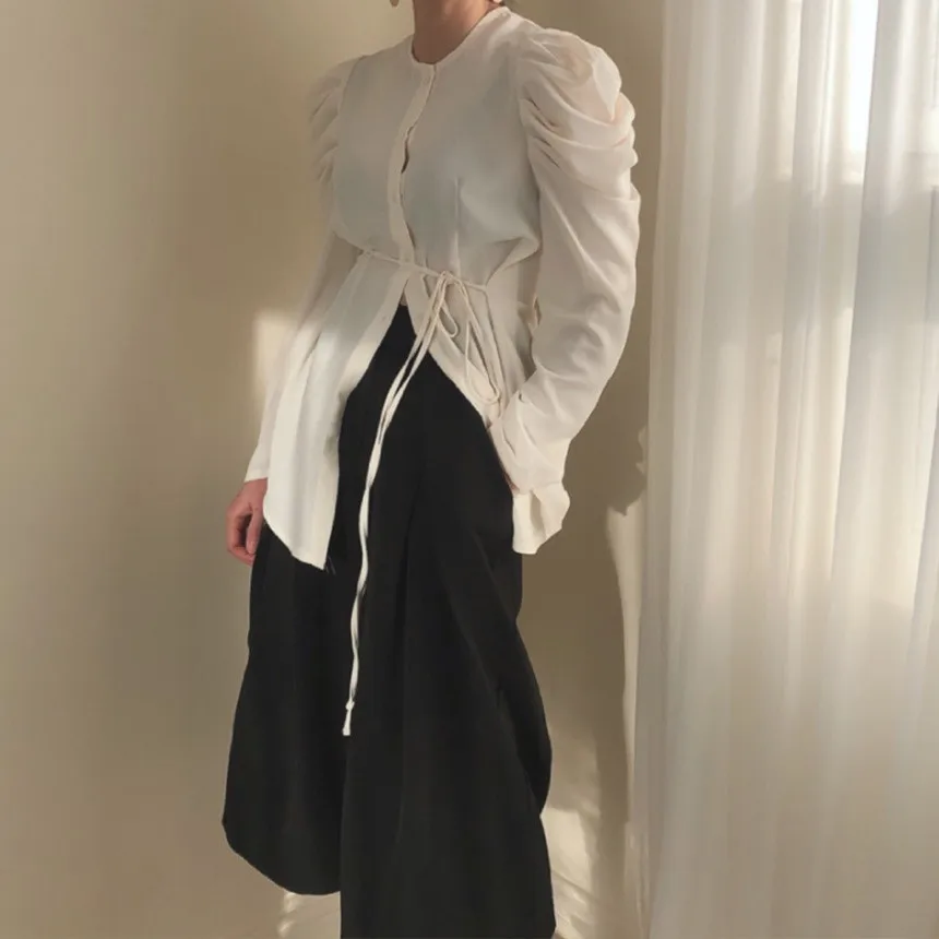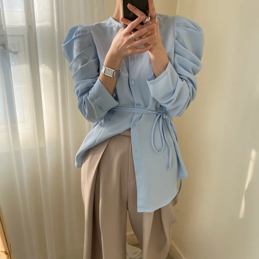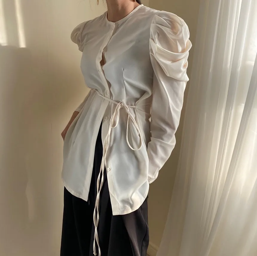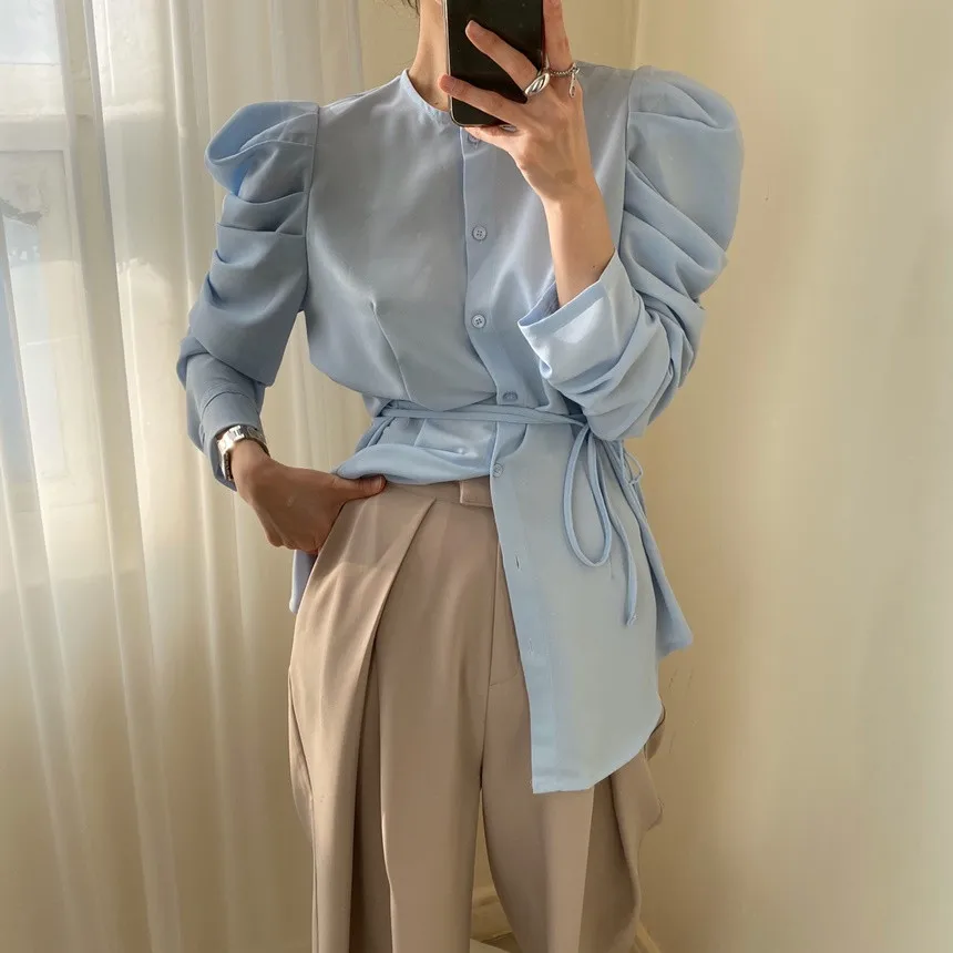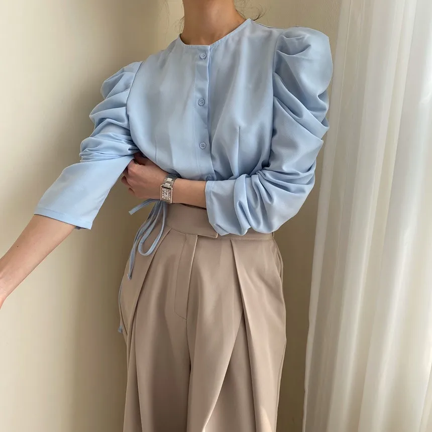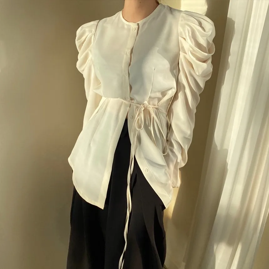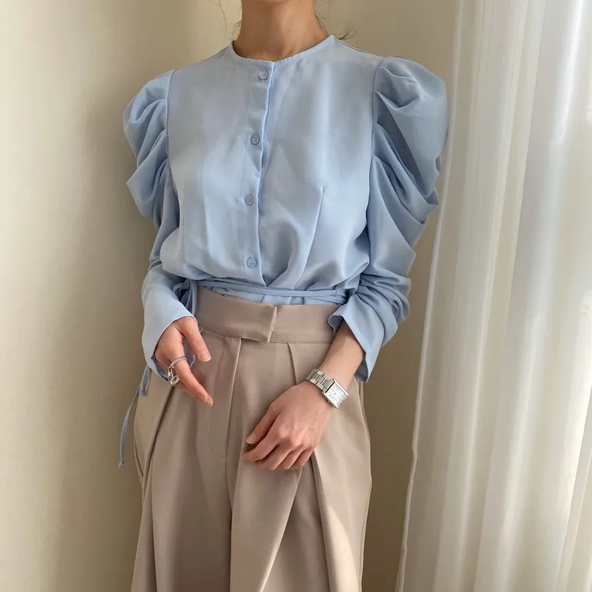 This shirt blouse can be mixed with jeans or elegant pants according to your mood and style. It has an o-neck shape, loose puffed sleeves, slim string.