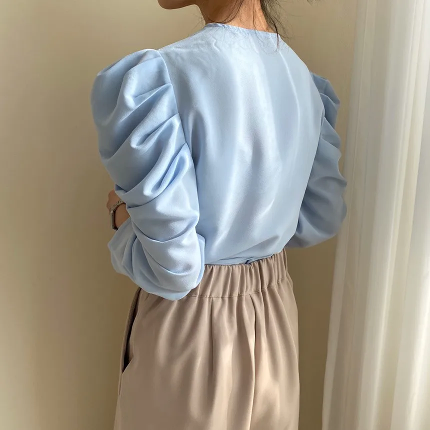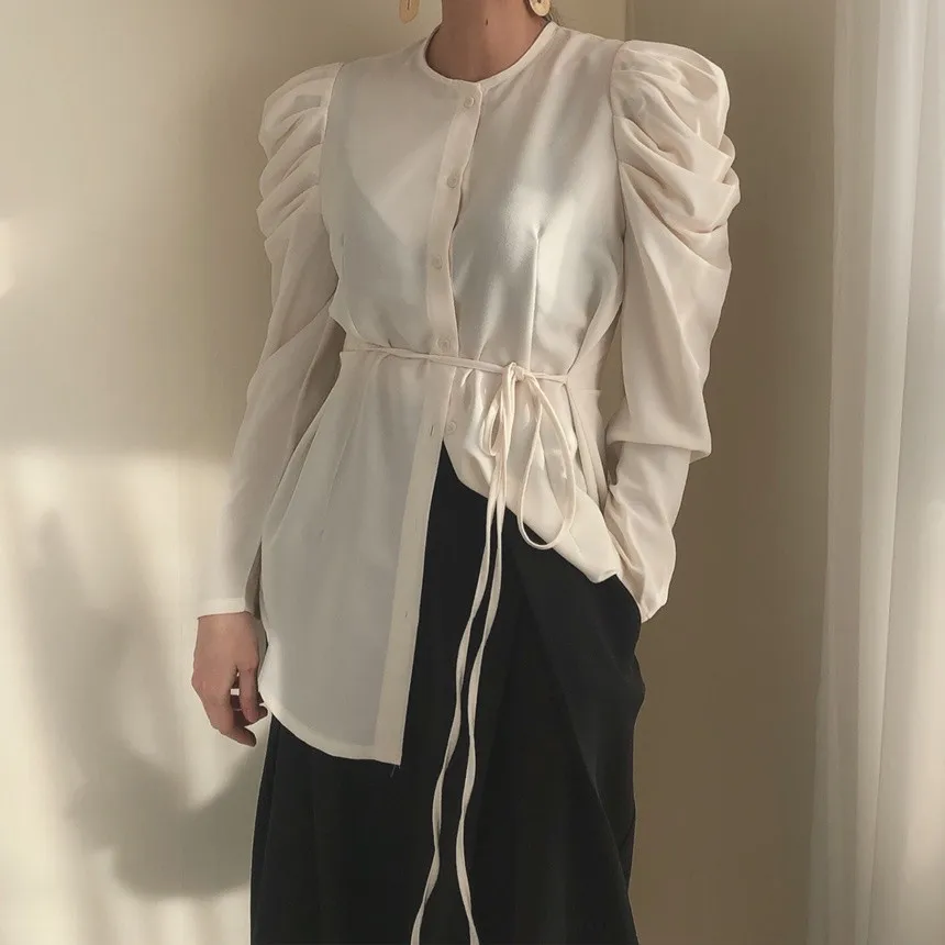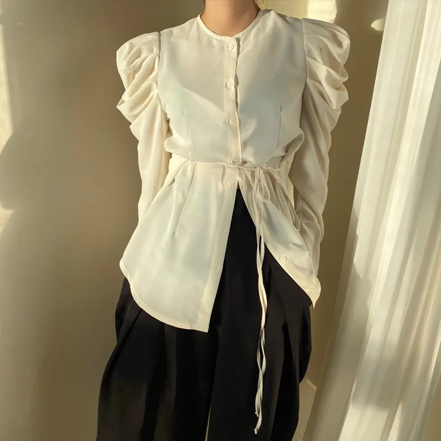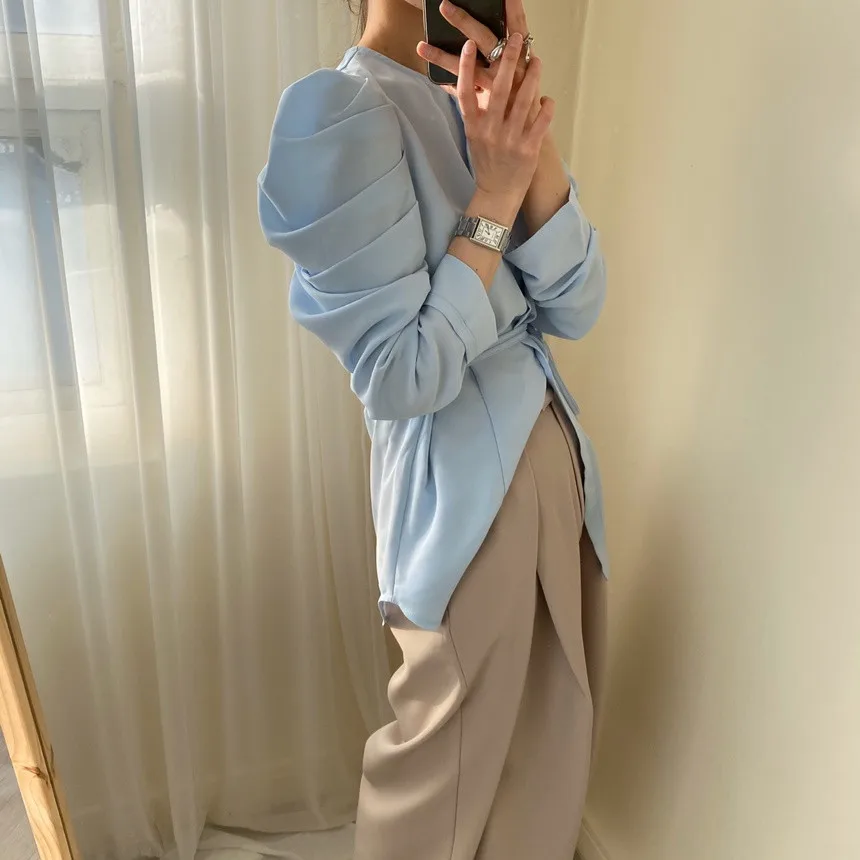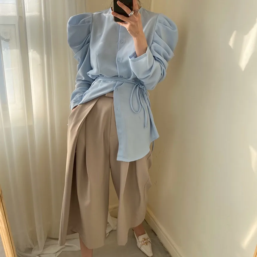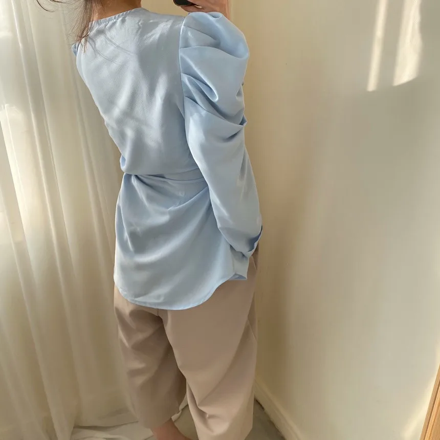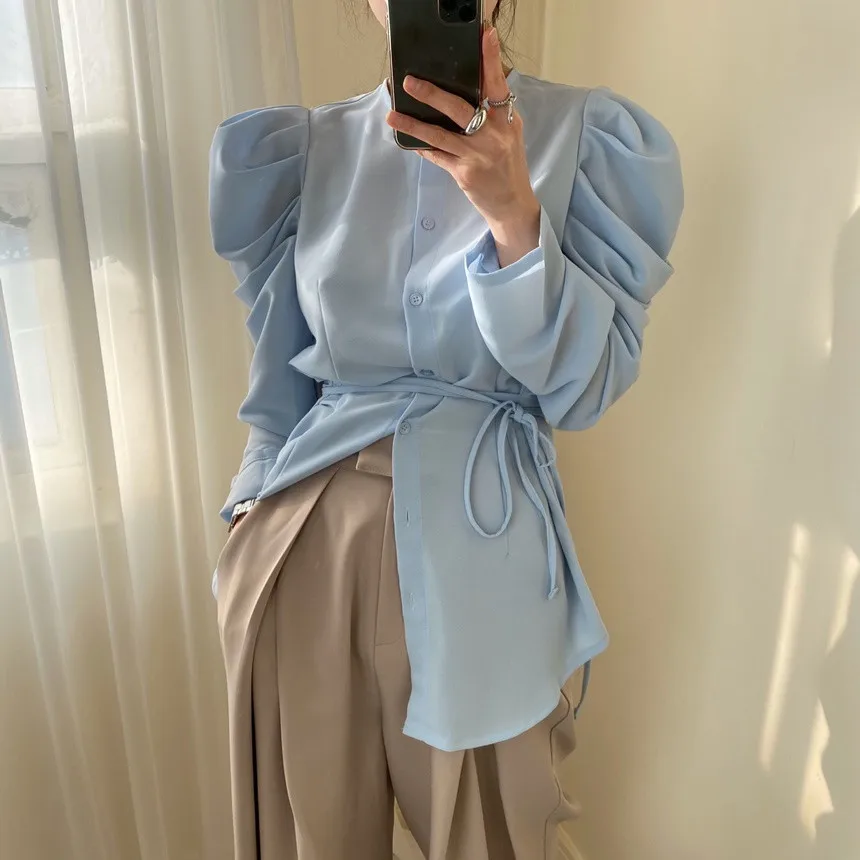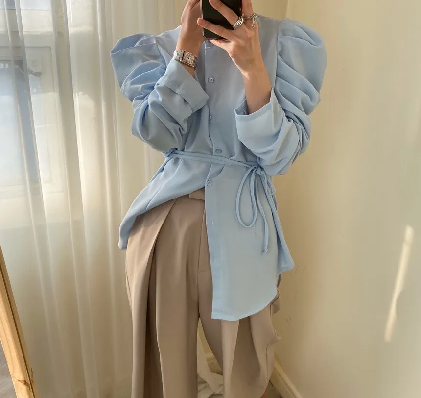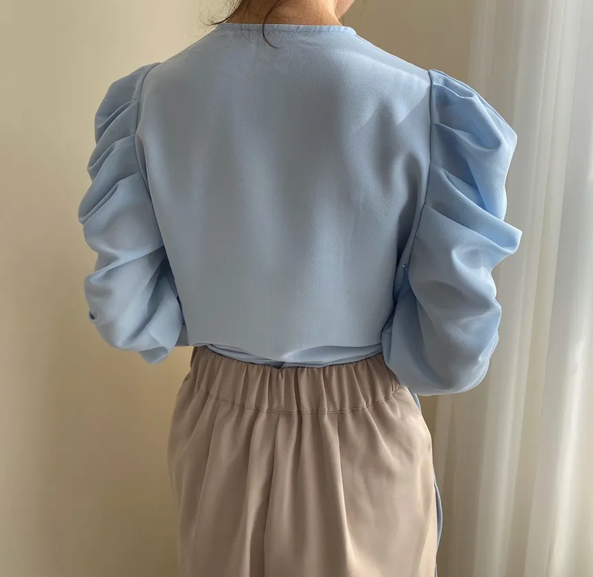 This shirt blouse can be mixed with jeans or elegant pants according to your mood and style. It has an o-neck shape, loose puffed sleeves, slim string.