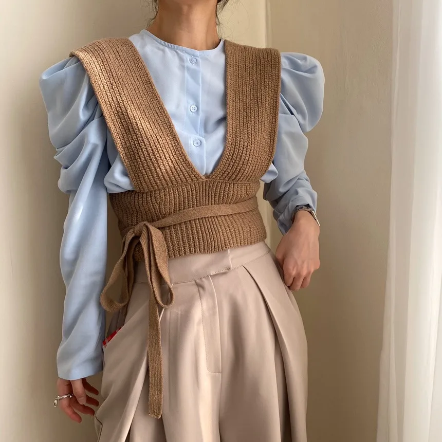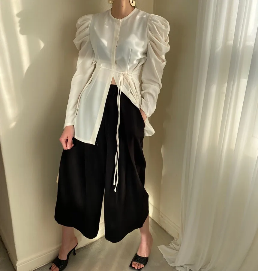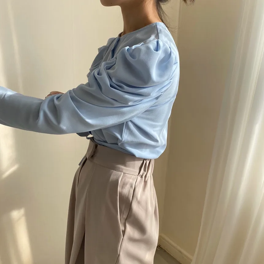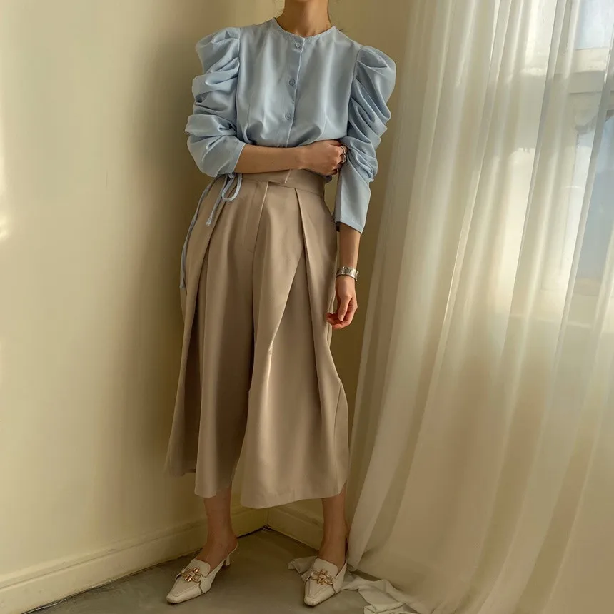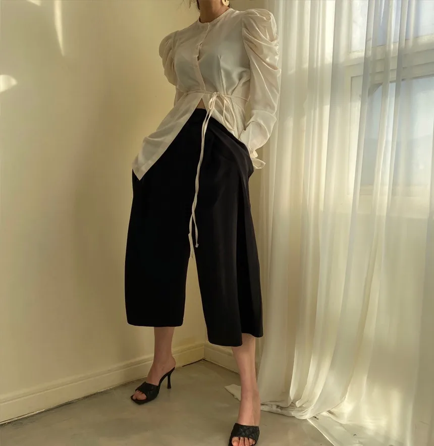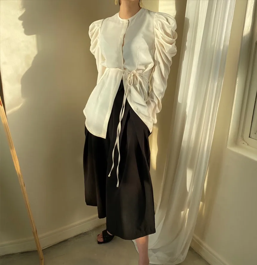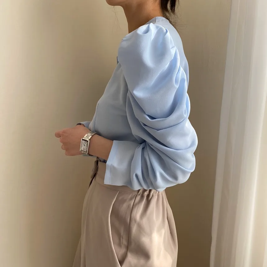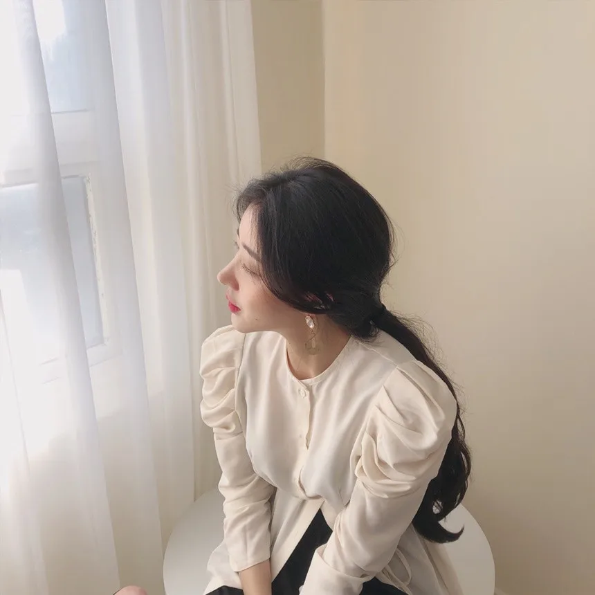 This shirt blouse can be mixed with jeans or elegant pants according to your mood and style. It has an o-neck shape, loose puffed sleeves, slim string.