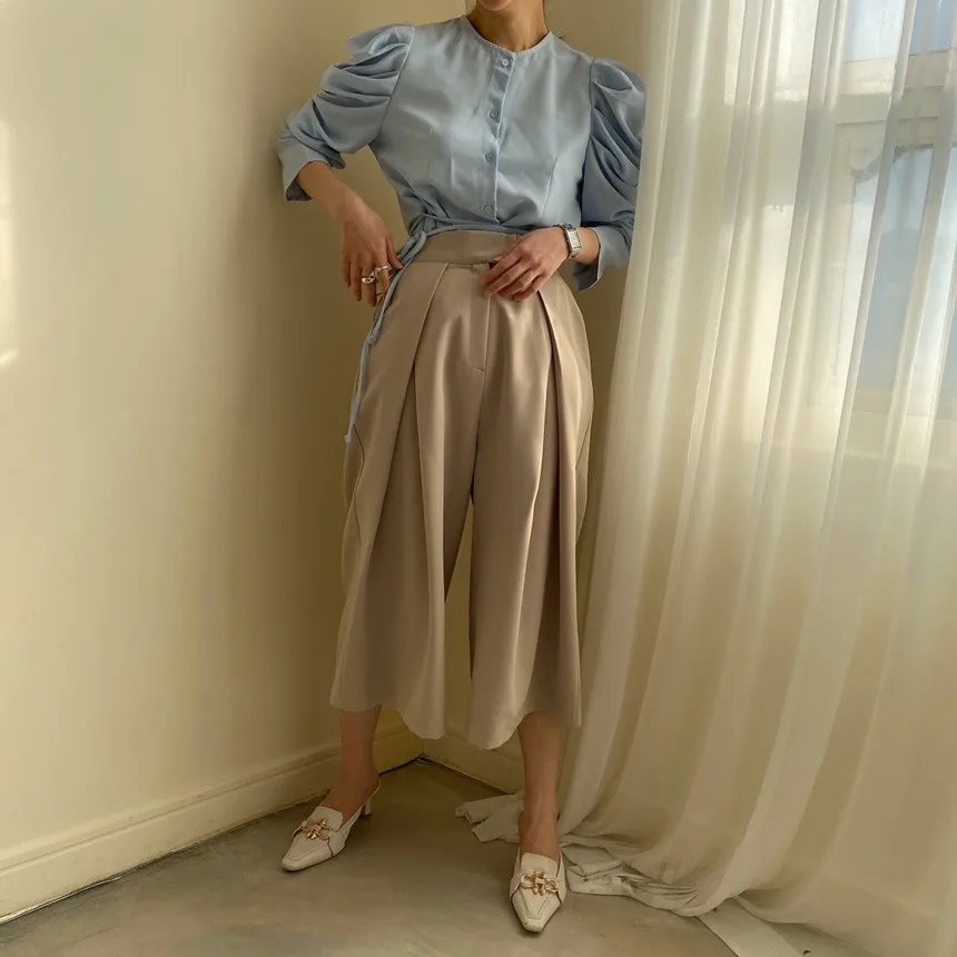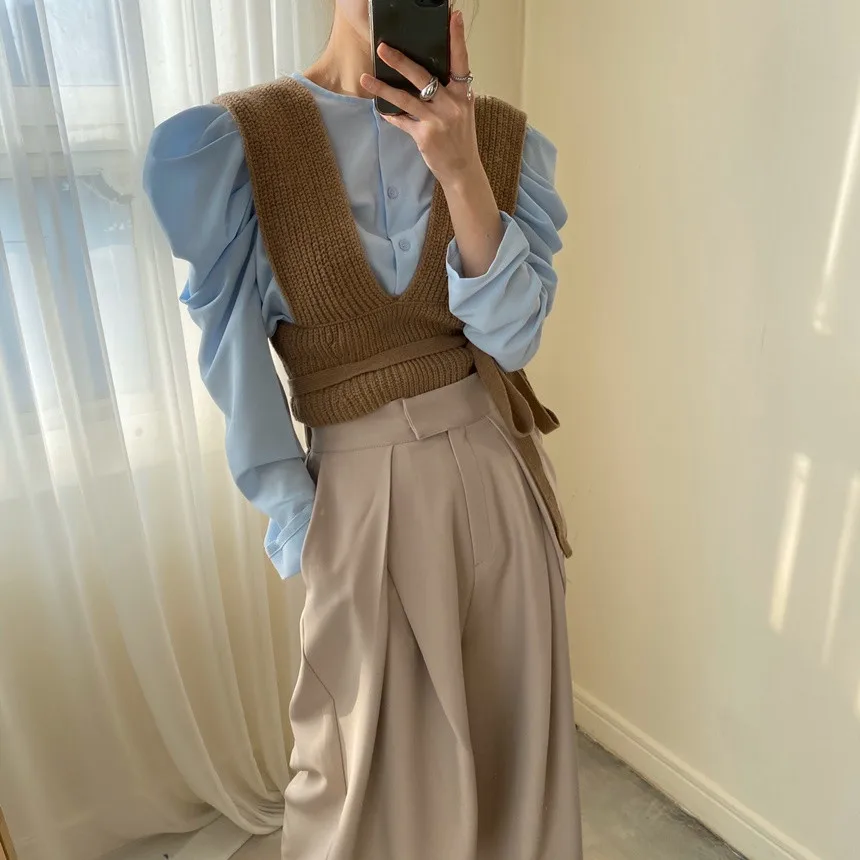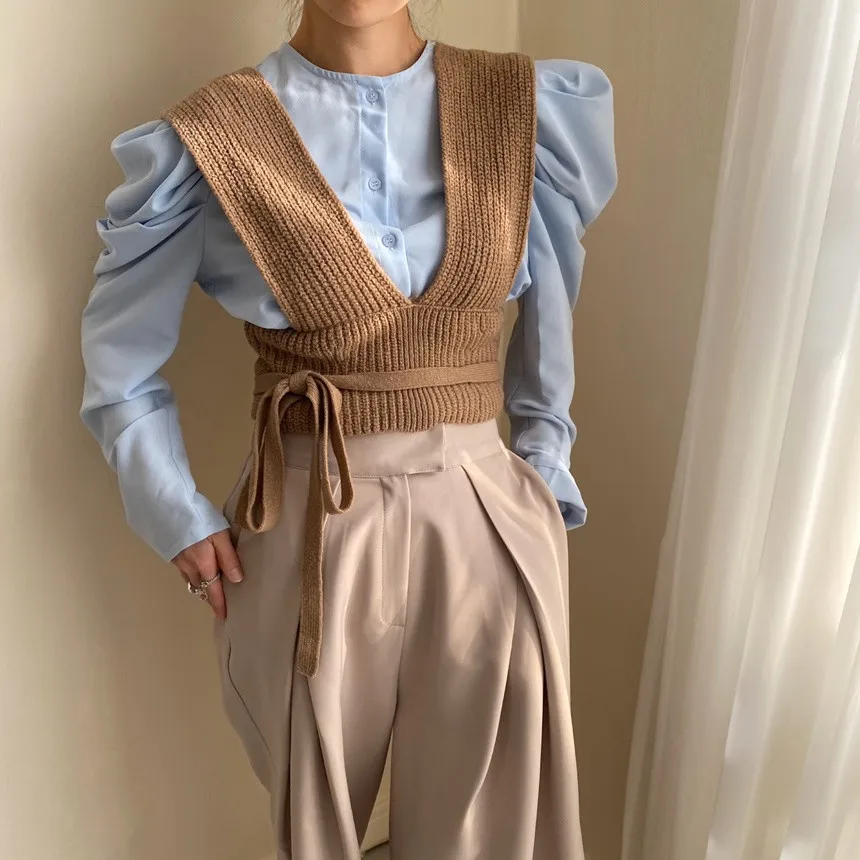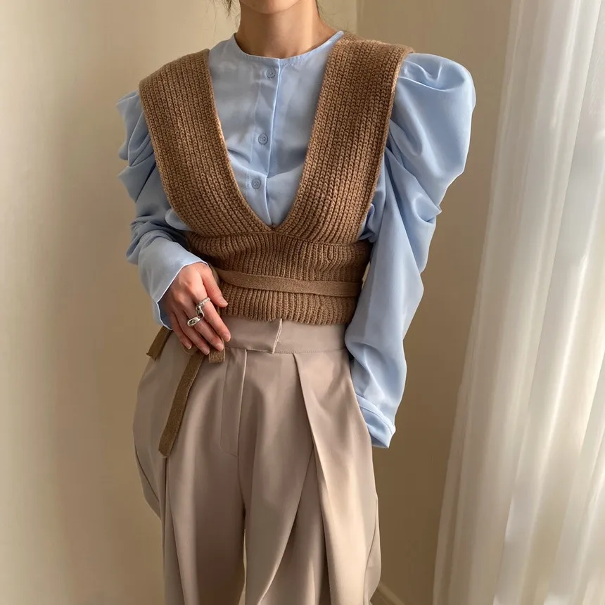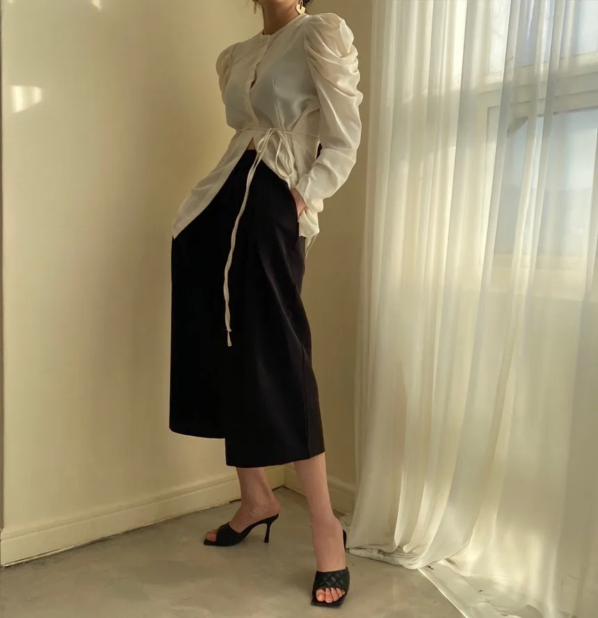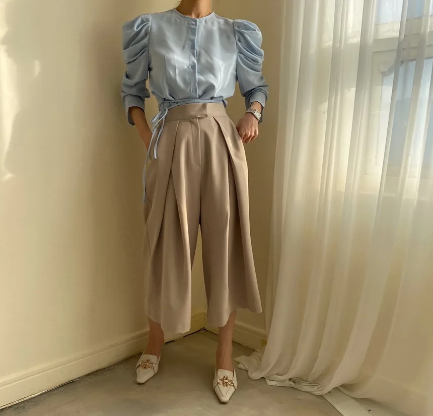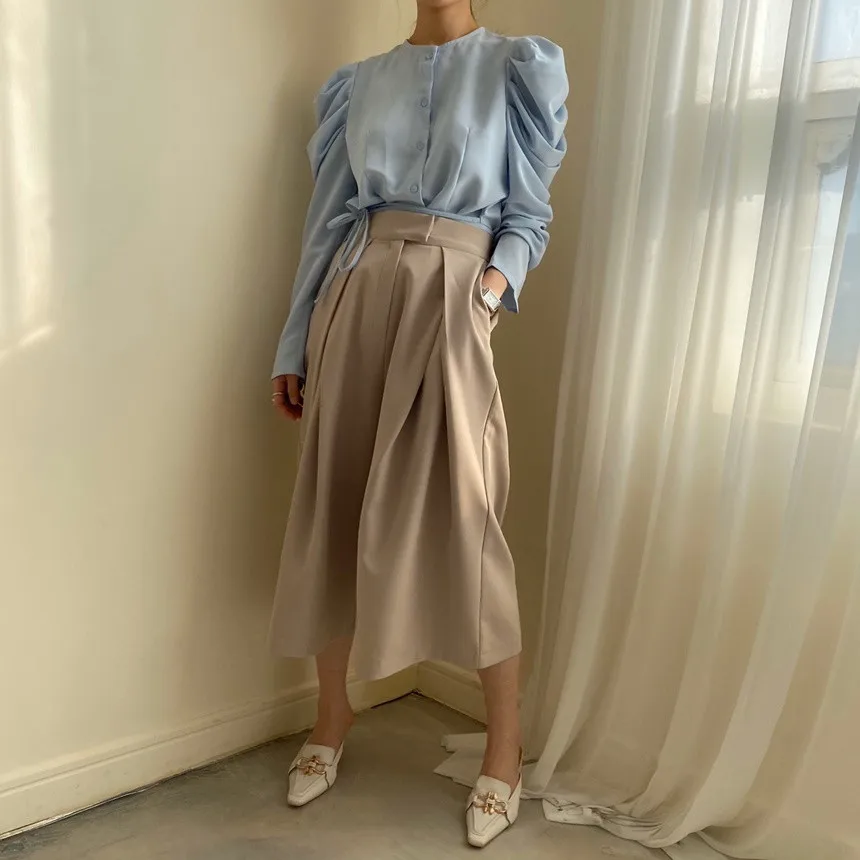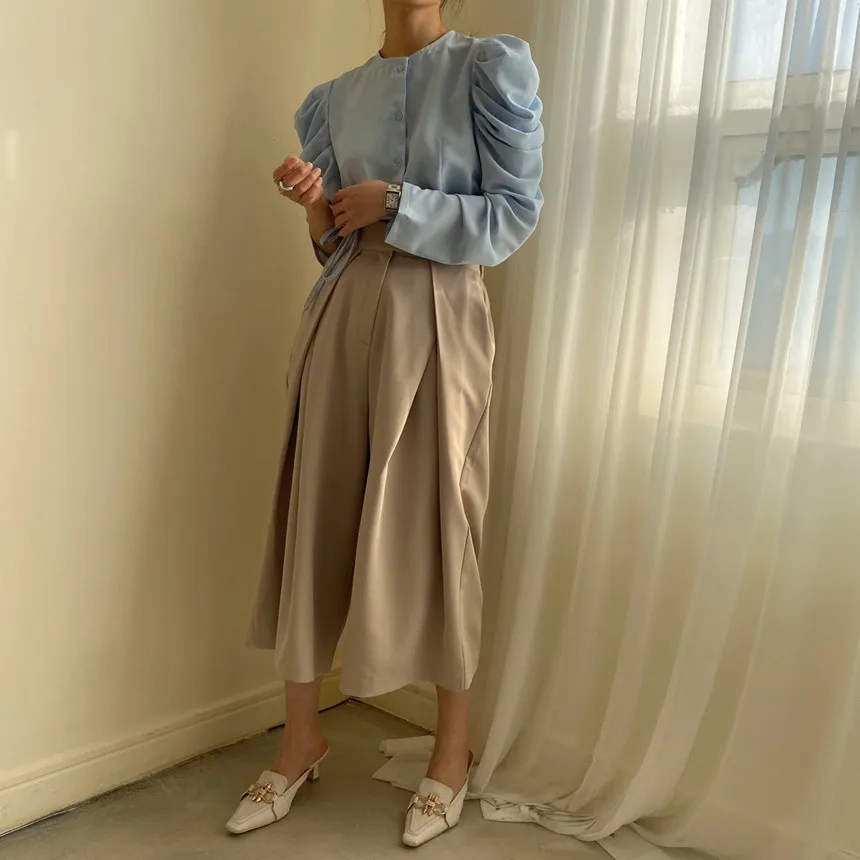 This shirt blouse can be mixed with jeans or elegant pants according to your mood and style. It has an o-neck shape, loose puffed sleeves, slim string.