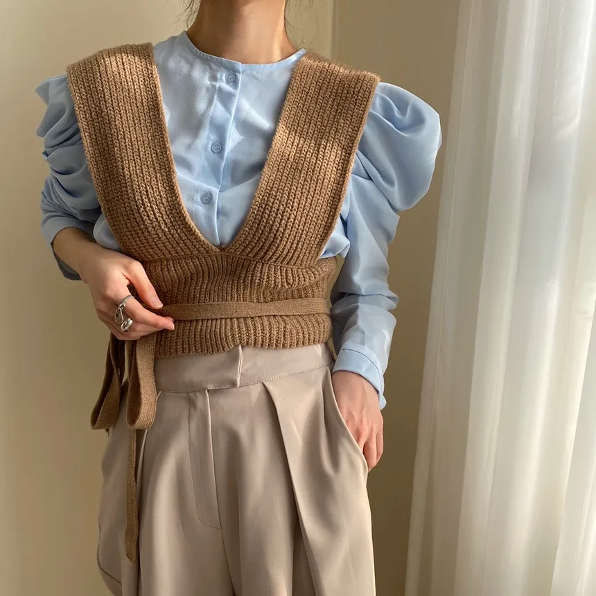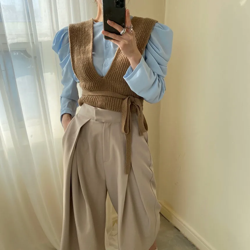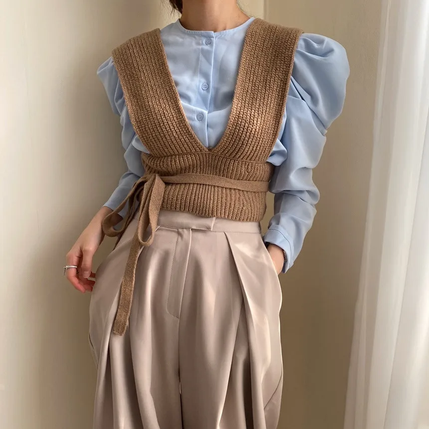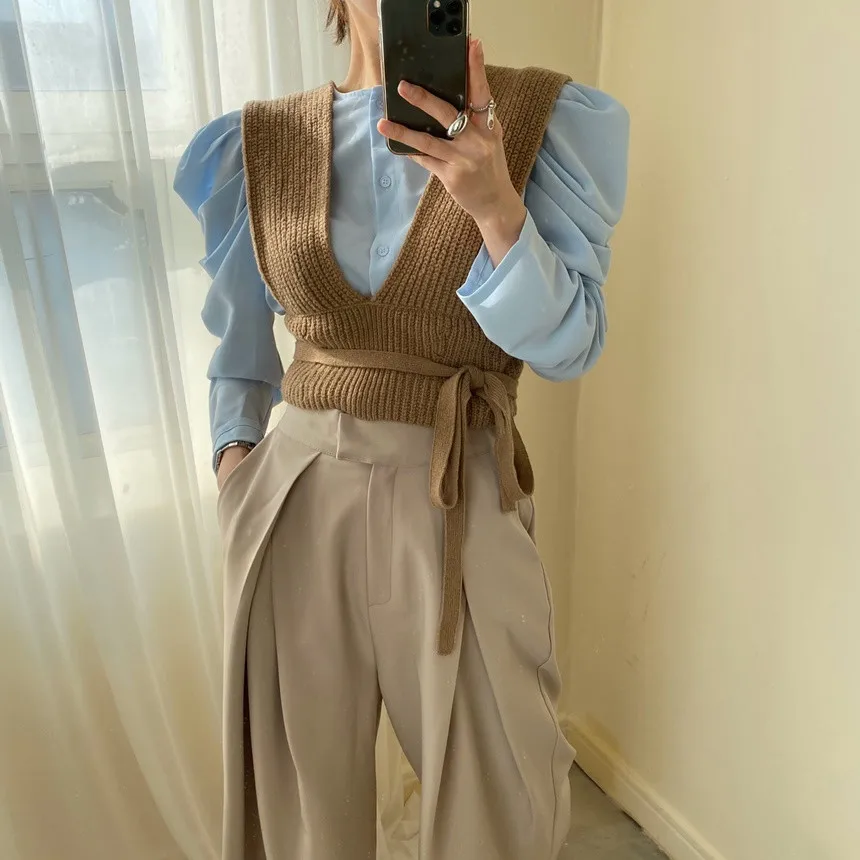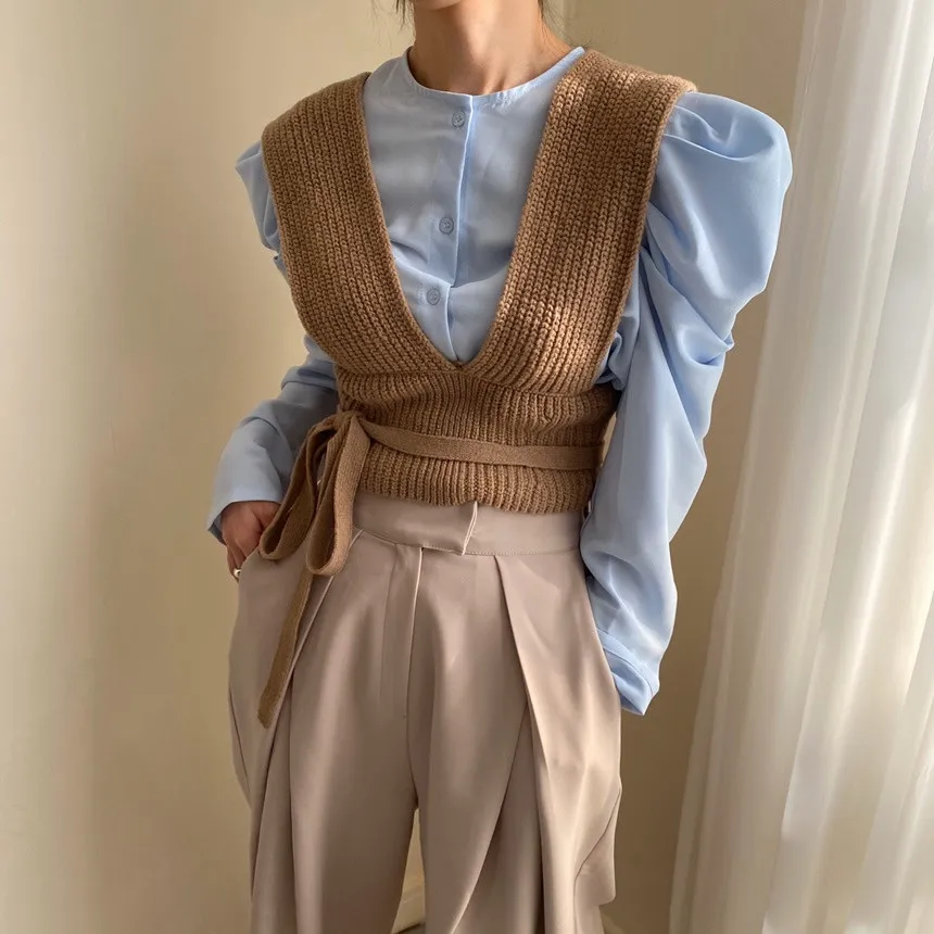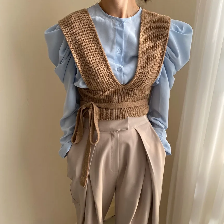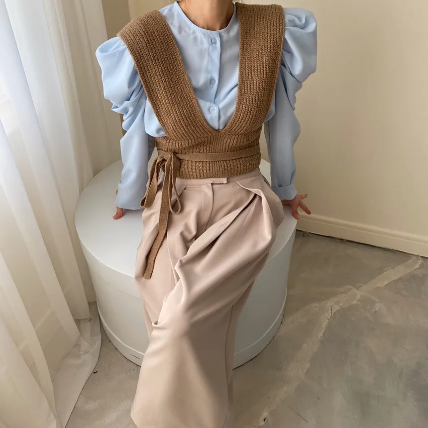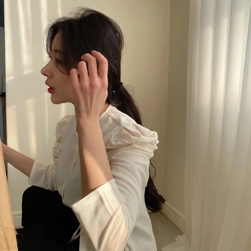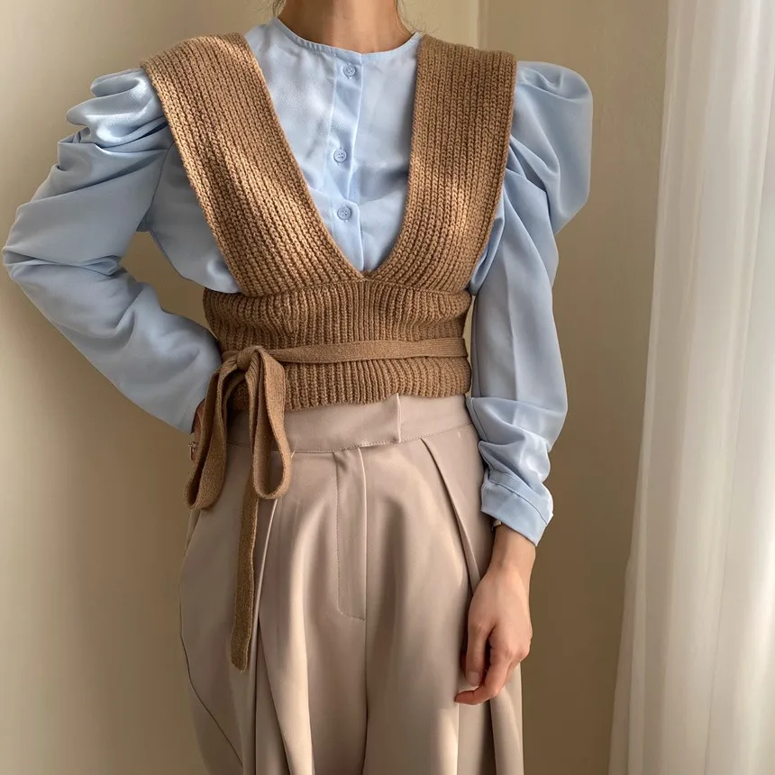 This shirt blouse can be mixed with jeans or elegant pants according to your mood and style. It has an o-neck shape, loose puffed sleeves, slim string.