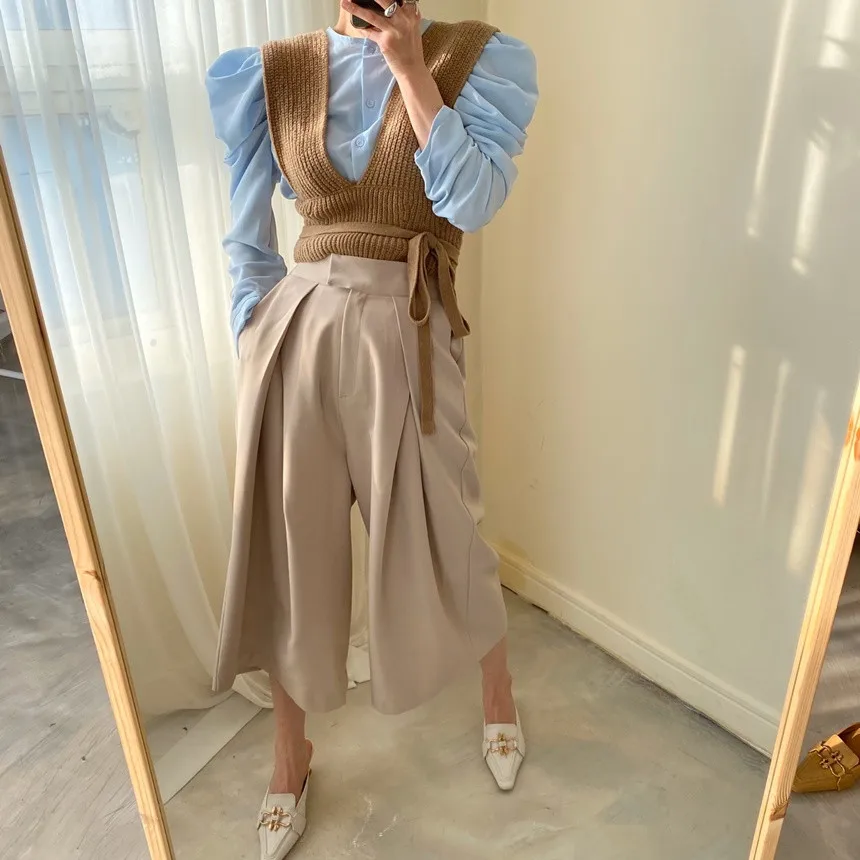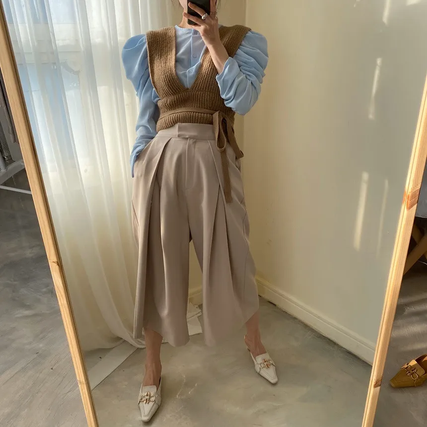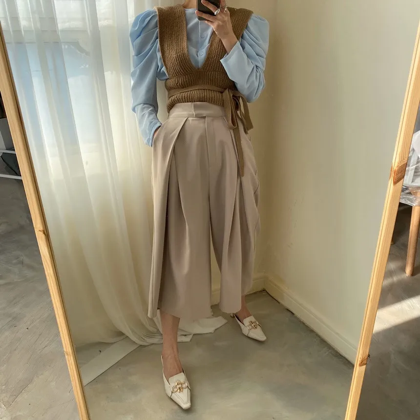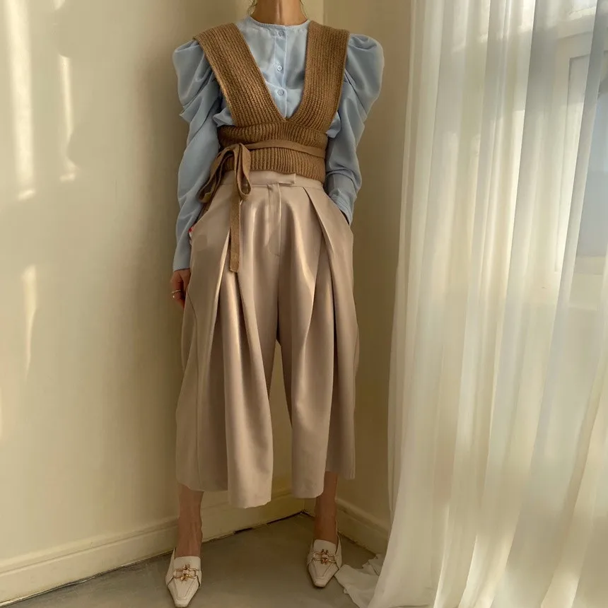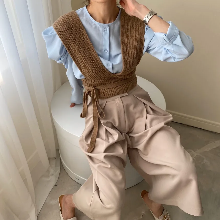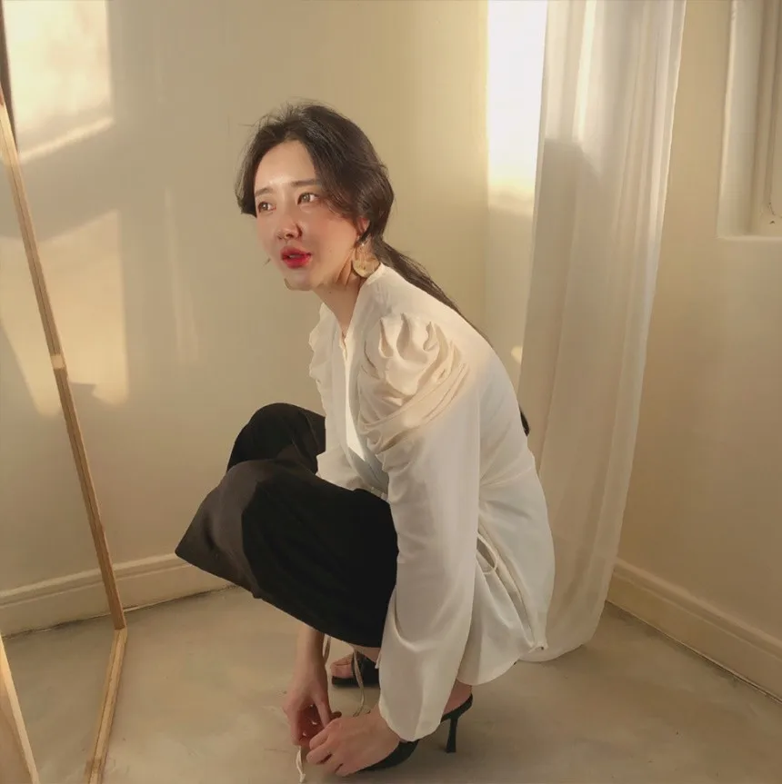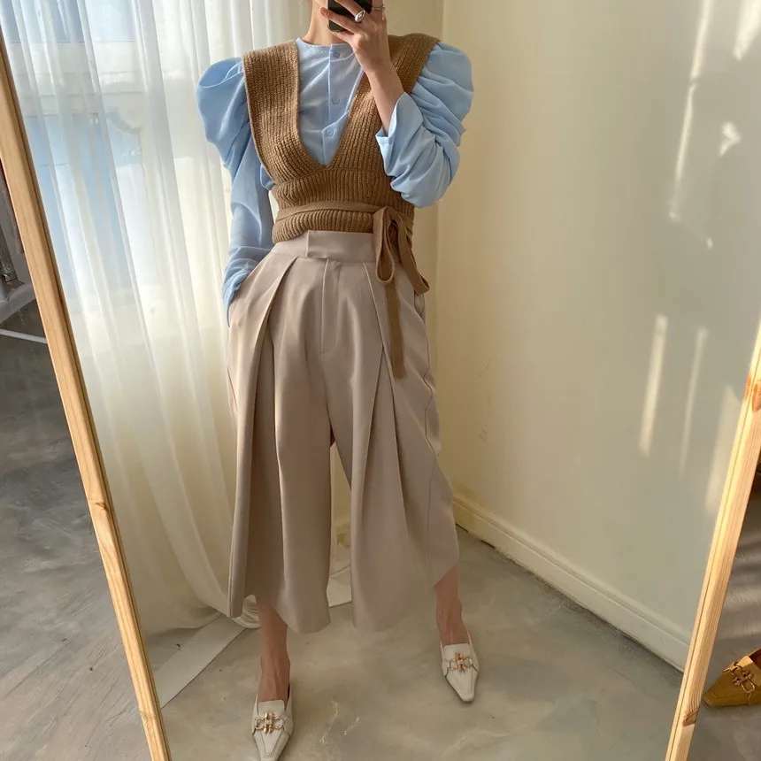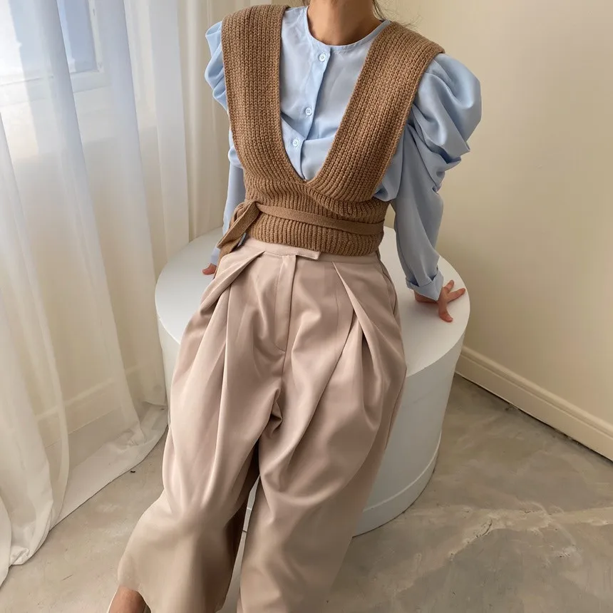This shirt blouse can be mixed with jeans or elegant pants according to your mood and style. It has an o-neck shape, loose puffed sleeves, slim string.