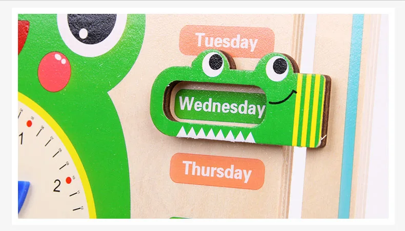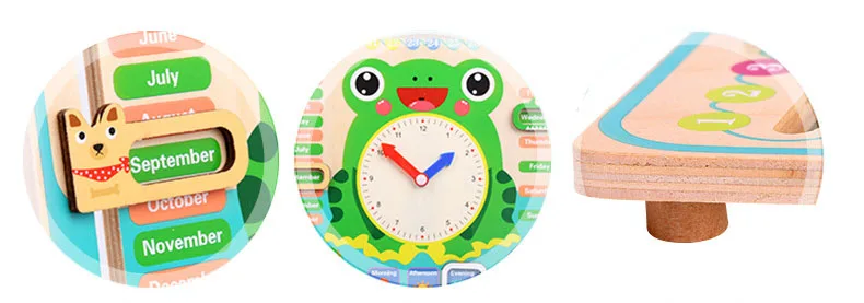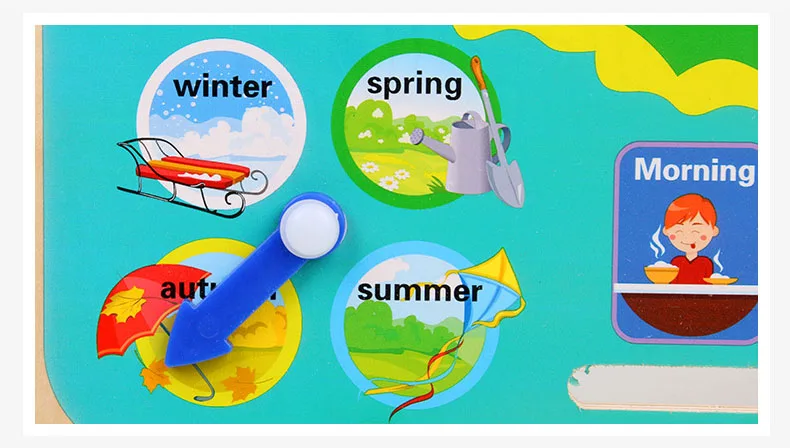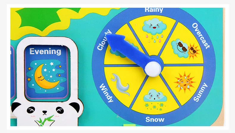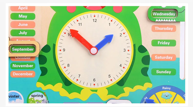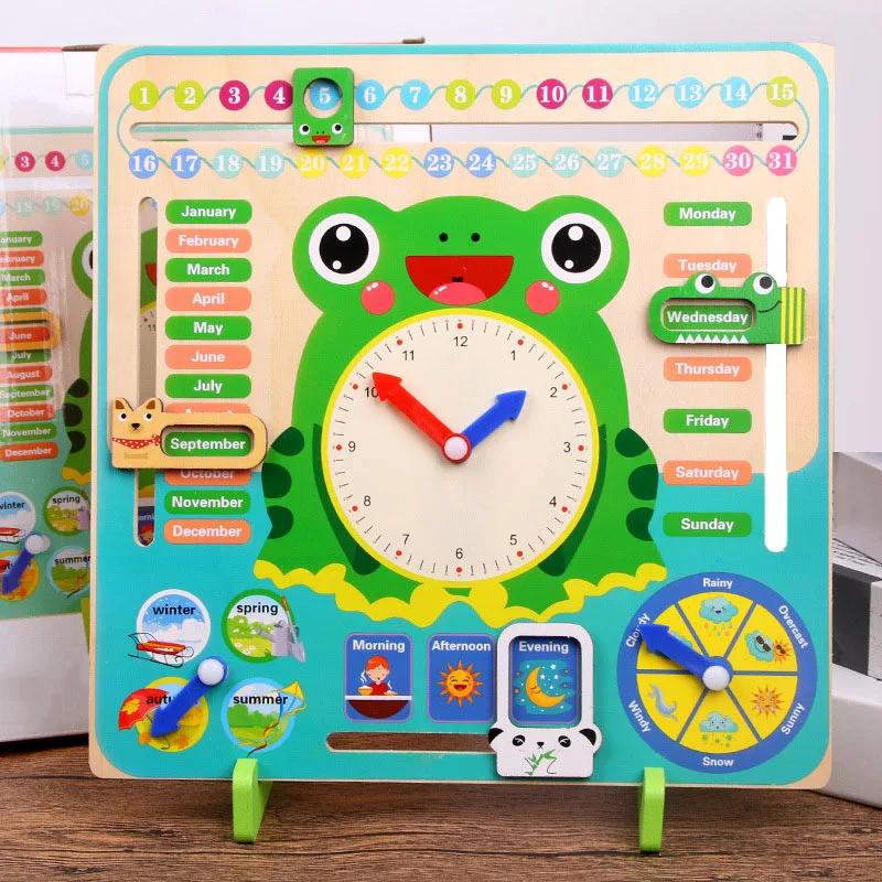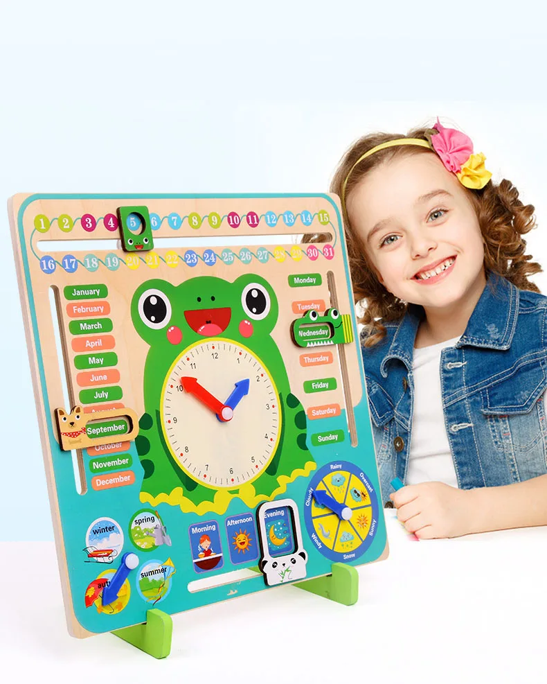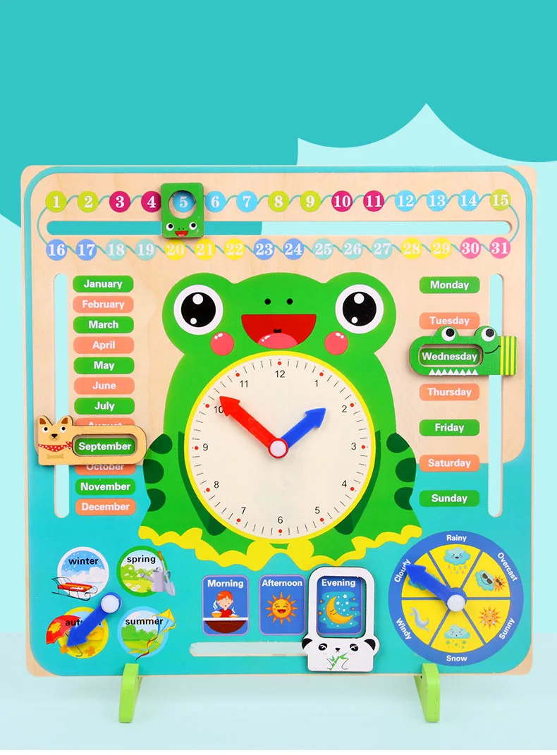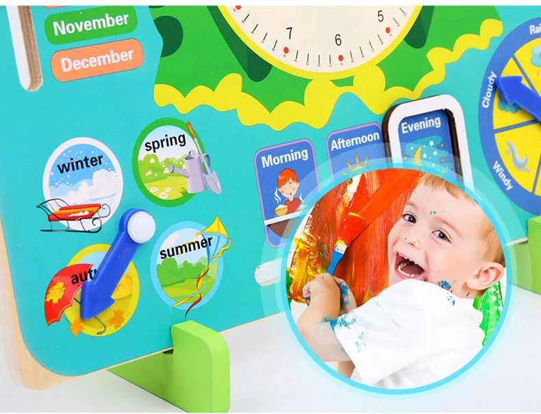 Educational preschool Montessori wooden toy that stimulates learning of seasons, days, weather, numbers, clock. Multifunctional learning that is both interactive and captivating.