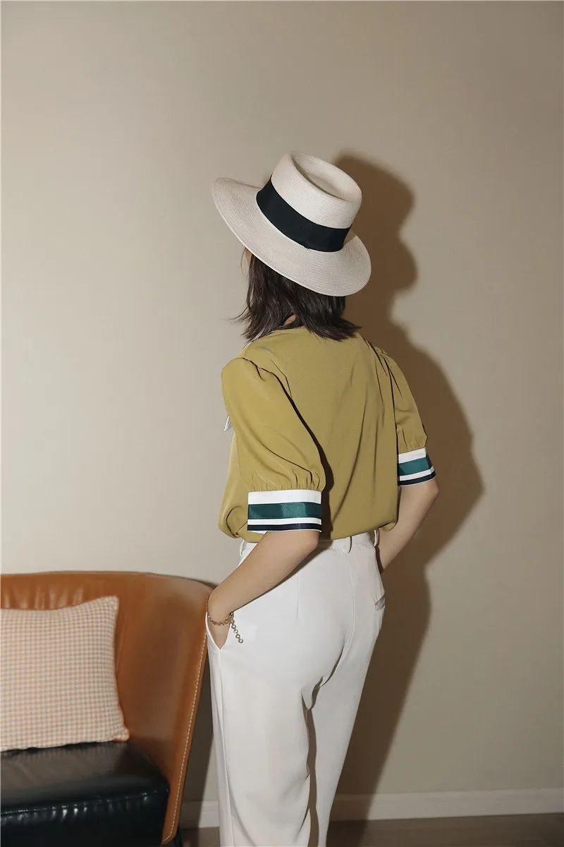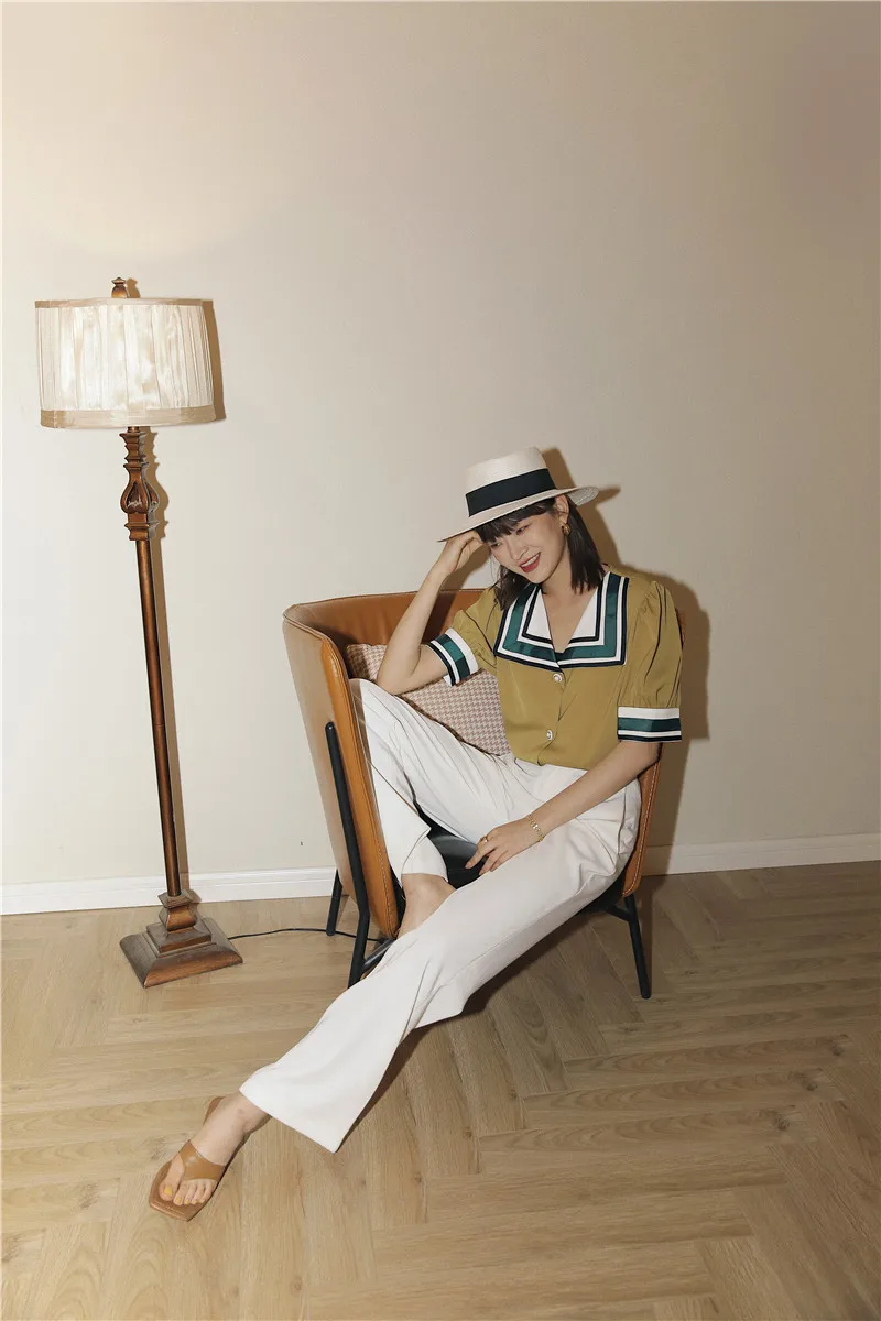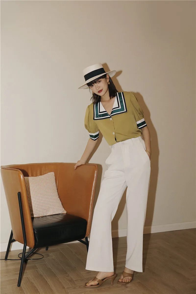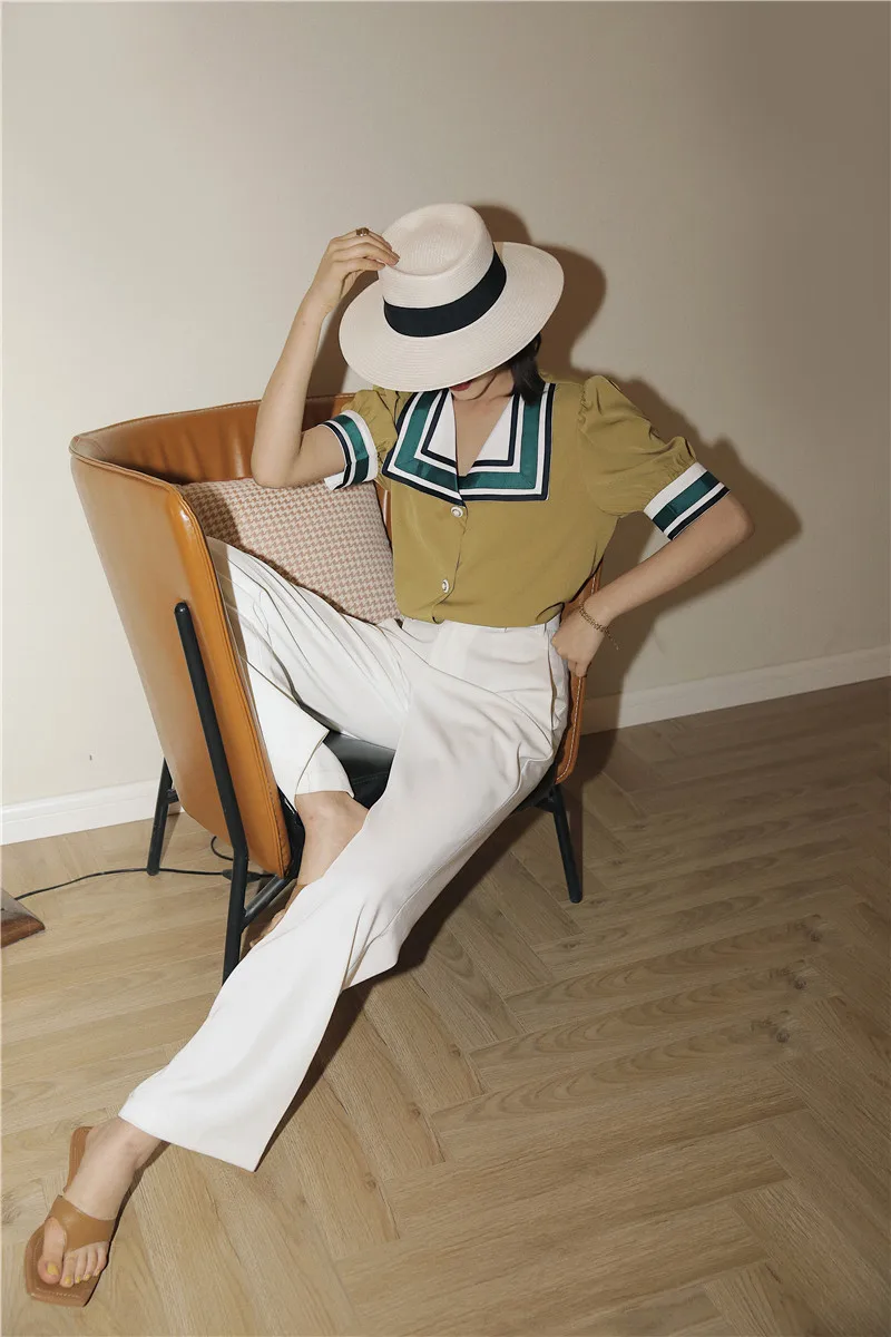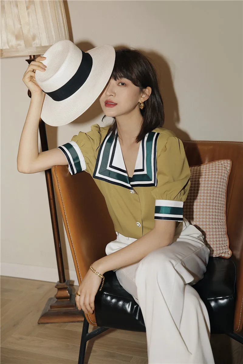 Moutard Vintage Sailor Collar Puff Sleeve Blouse, so chic and trendy! With these short puffy sleeves, its marine collar like a tie, your style will be out of the ordinary. The vintage touch creates a Parisian look every Instagrammer is keen on. With this Parisienne allure, you can’t go wrong, the modern retro is here to make a statement.