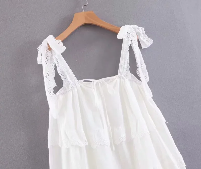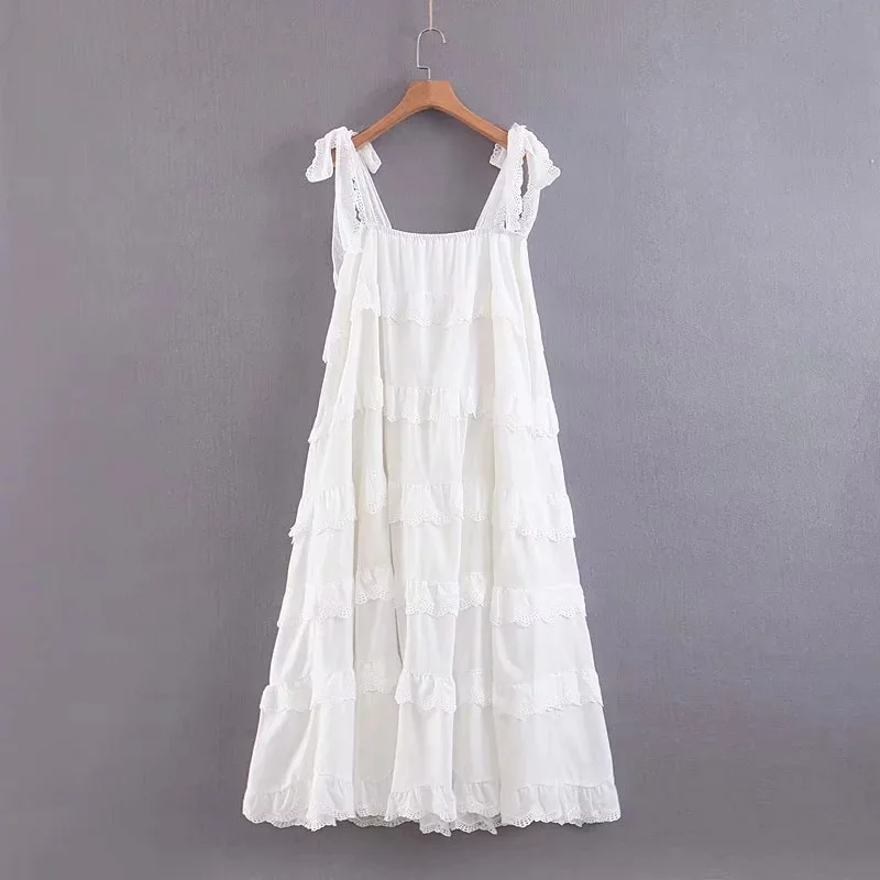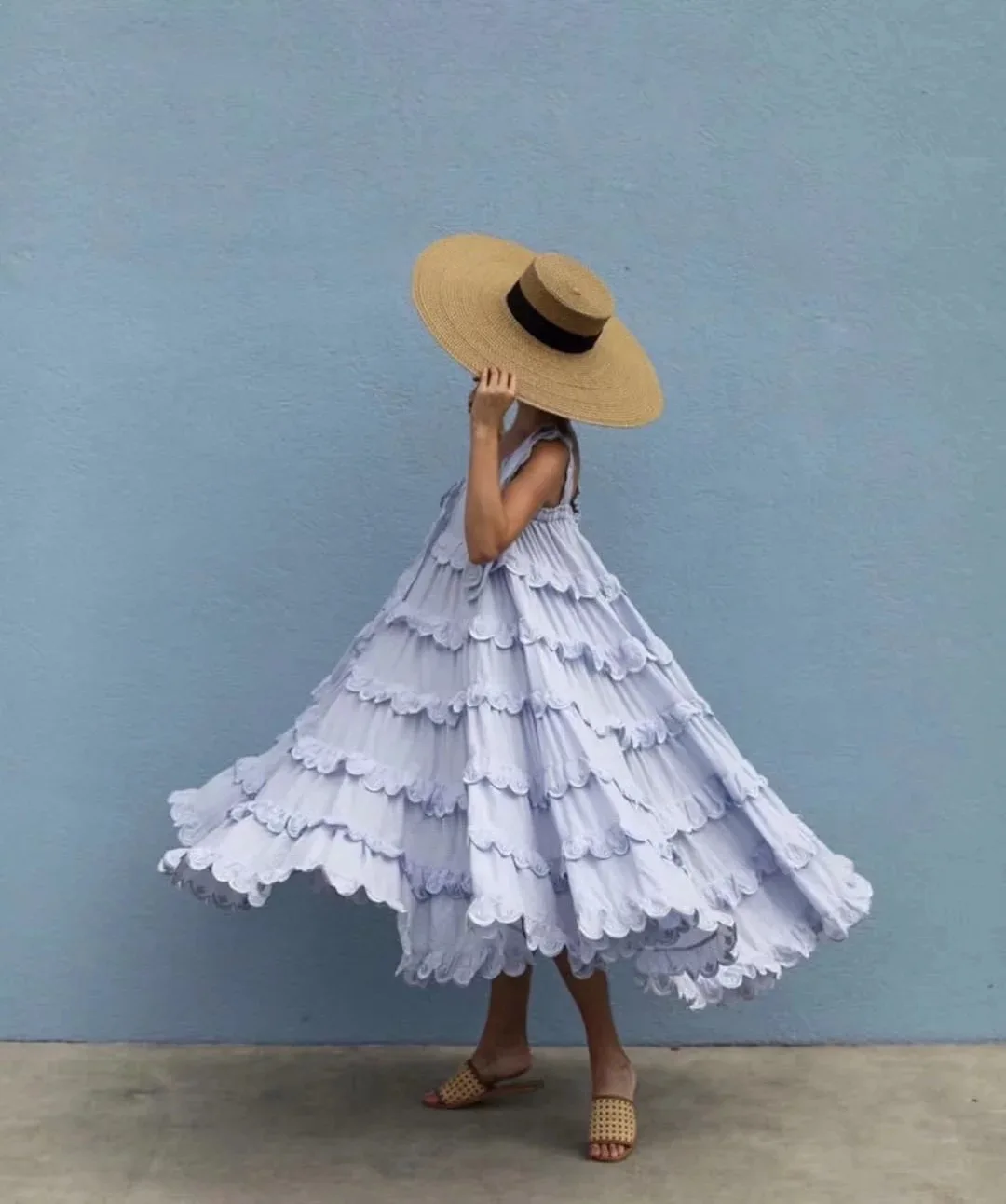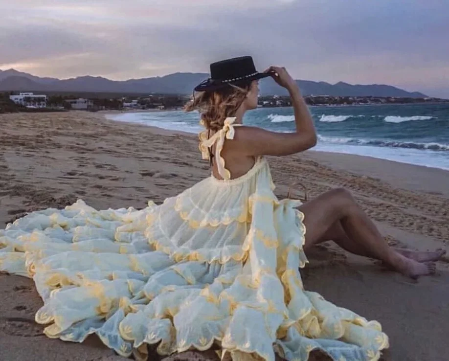 Petal Ruffles Maxi Summer Dress is an out-of-the-ordinary dress. Loose, bohemian chic, sleeveless, and with a petal-like kind of mood, this maxi dress is a must-have for all your comfy summer days. Its strapless style with embroidery-type straps is so idyllic.