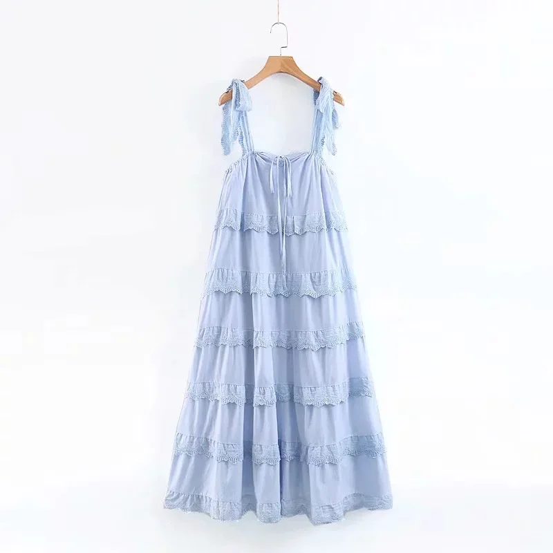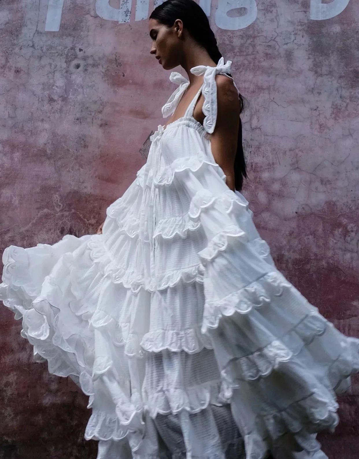Petal Ruffles Maxi Summer Dress is an out-of-the-ordinary dress. Loose, bohemian chic, sleeveless, and with a petal-like kind of mood, this maxi dress is a must-have for all your comfy summer days. Its strapless style with embroidery-type straps is so idyllic.