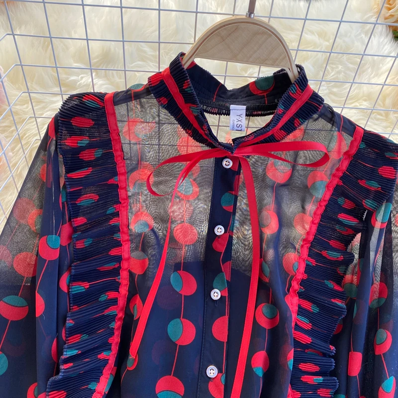 Puff Sleeves Chiffon Blouse is an elegant choice in terms of blouses, shirts. This printed motif blouse is subtle and can be worn for a chic outfit. With puffed sleeves, buttons, a small bow and polka dot motifs, this blouse is very feminine.