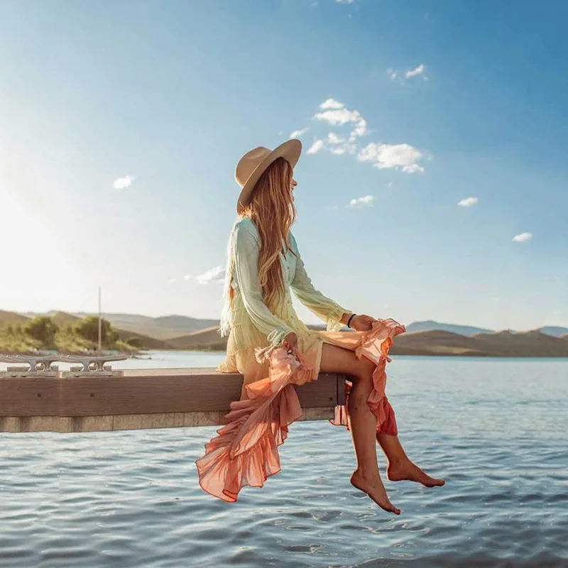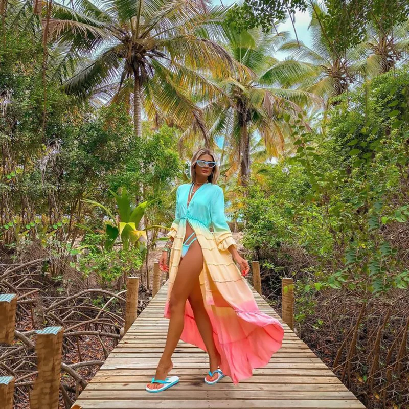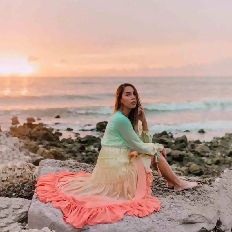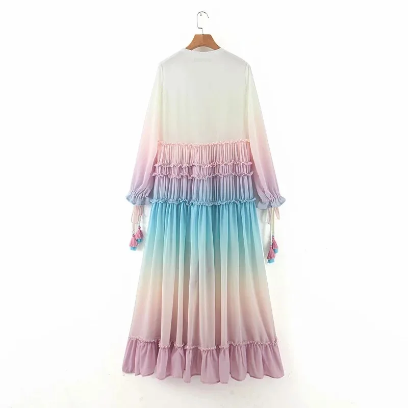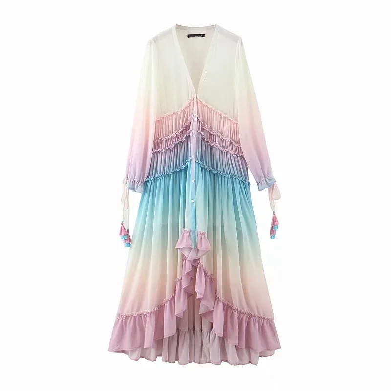 Rainbow Boho Maxi Dress is the top summer luxury you can wear. With long sleeves and tassels, buttons, gradient rainbow colors, ruffles, and floating sensations are with you.