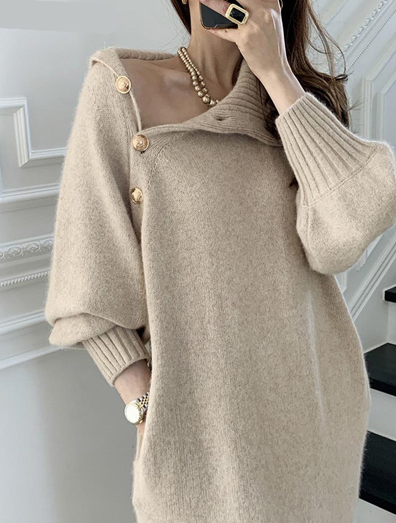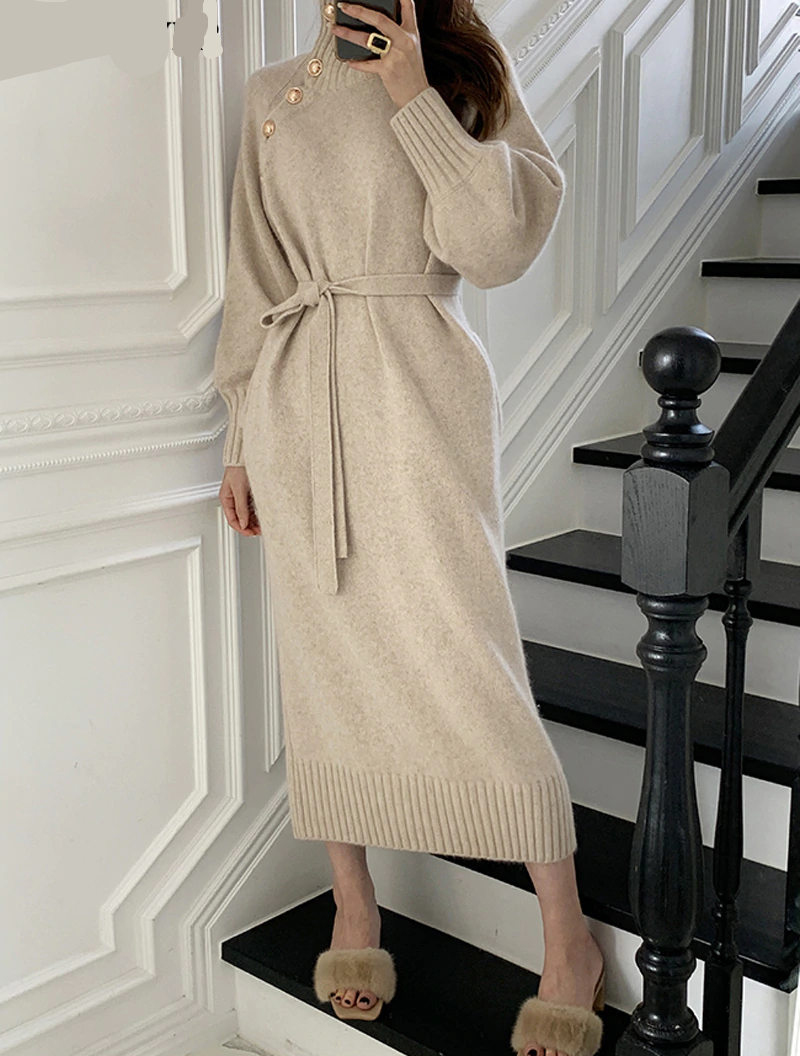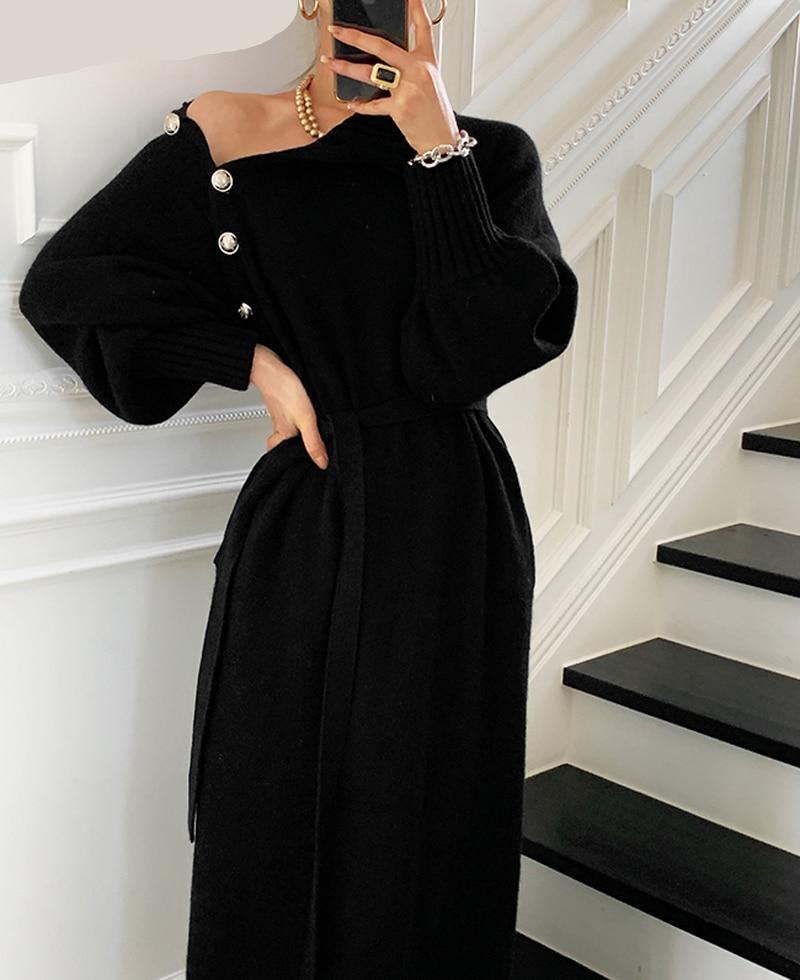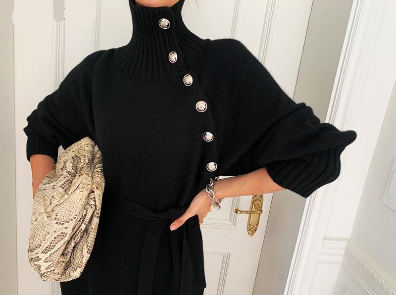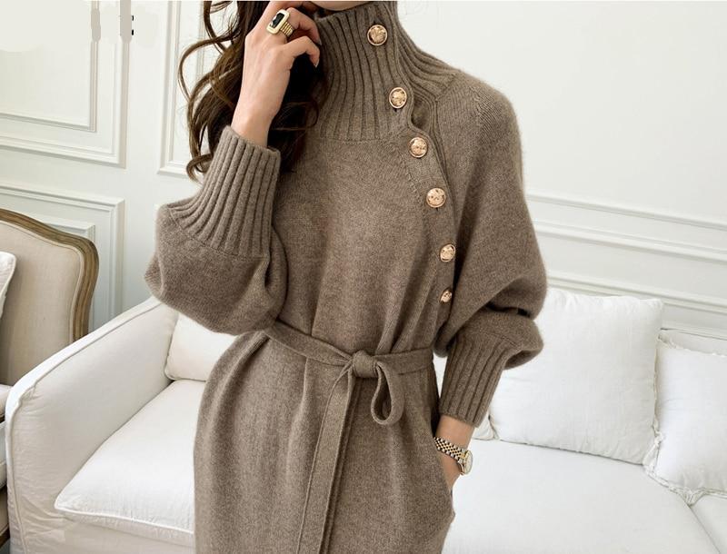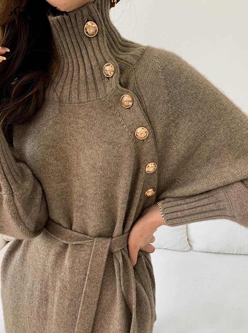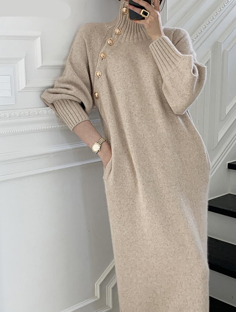 Turtleneck Midi Long Knitted Sweater Dress is very stylish. It has buttons to unveil your shoulder or keep them warm, to create a feminine touch to this sweater dress.