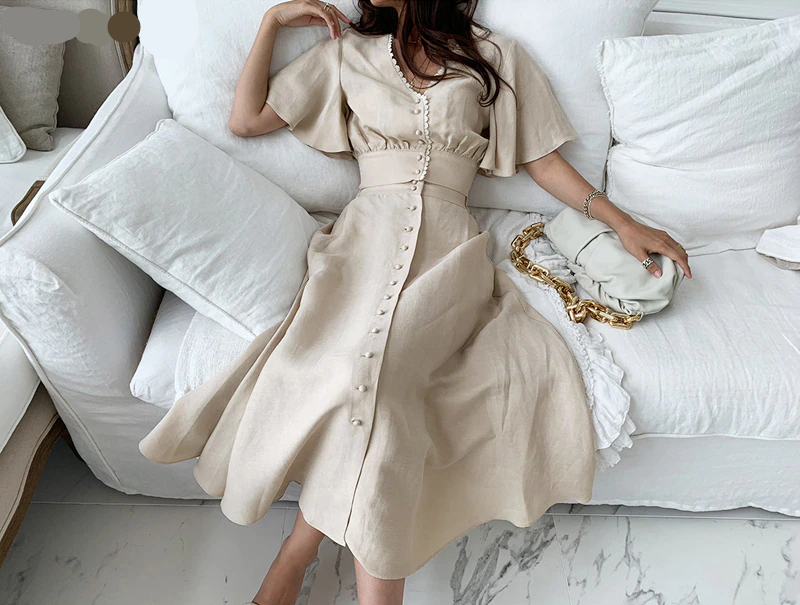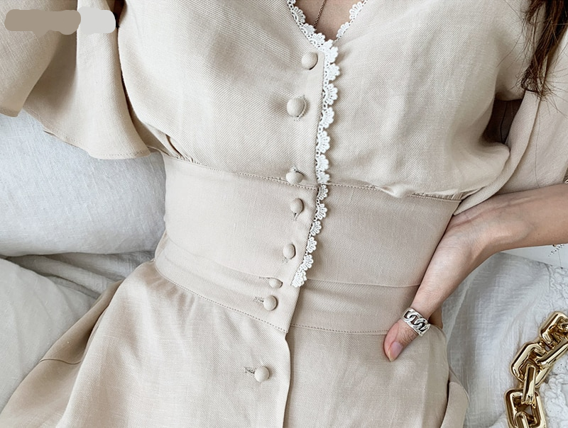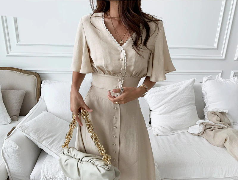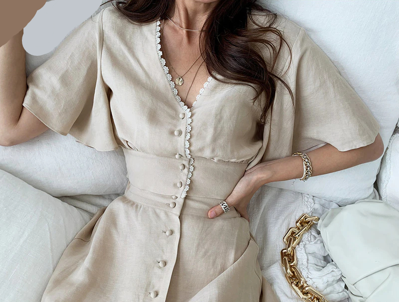 V-neck A-line Summer 2 Pieces Dress Set is a perfect elegant summer dress that can fit your summer strolls. Linen fabric and buttons, fit on your waist and with an A-line shape, this 2 piece dress set is the casual look one must-have.