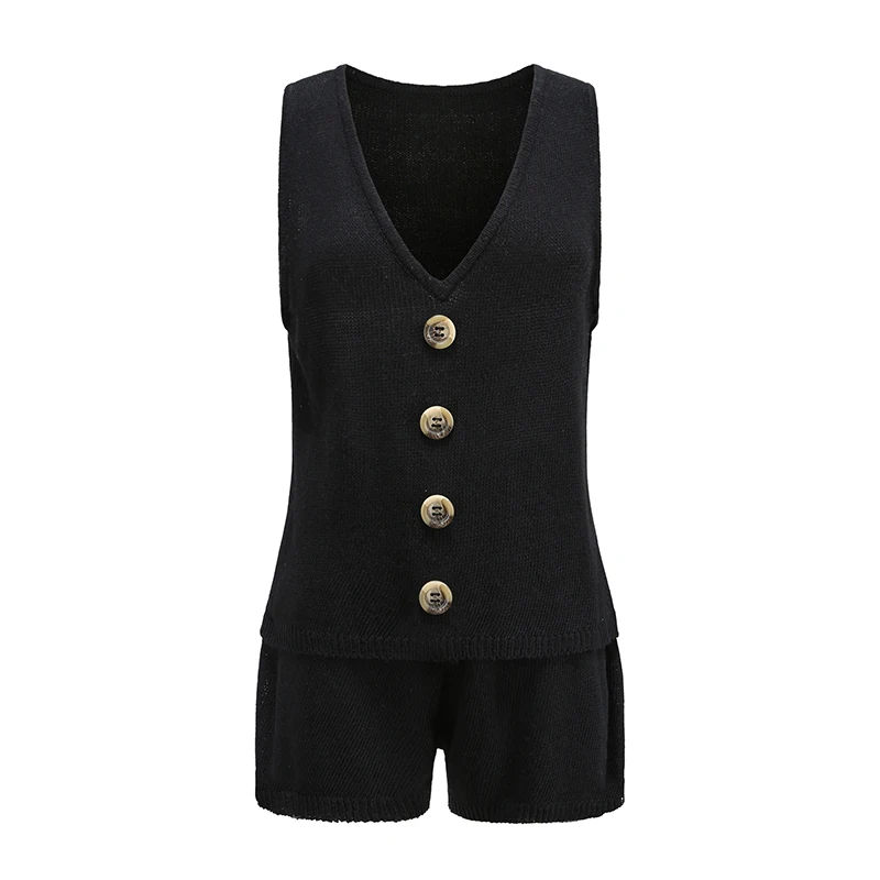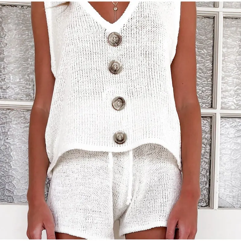 Vest and Shorts Summer Knit Set has a loose leisure design perfect for summertime. The summer knitwear is known to be very refreshing and cool for the body with its loose fiber and texture. The Hollow Out type for the sleeveless V-neck Vest with Buttons creates that chic and je m’en fous vibe.